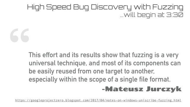3:30 This effort and its results show that fuzzing is a very universal technique, and most of its components can be easily reused from one target to another, especially within the scope of a single file format. -Mateusz Jurczyk https://googleprojectzero.blogspot.com/2017/04/notes-on-windows-uniscribe-fuzzing.html