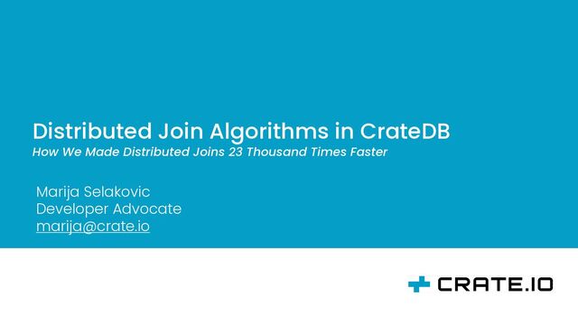 This talk will show our approach to implementing distributed equi-join operator in CrateDB that exhibits significant performance improvements compared to the original nested loop algorithm. CrateDB is an open-source, distributed SQL database that runs queries on millions of data records daily. It scales up to hundreds of nodes and PBs of indexed data making the performance of join operators highly important: it is required to have efficient algorithms that can scale with the input size.