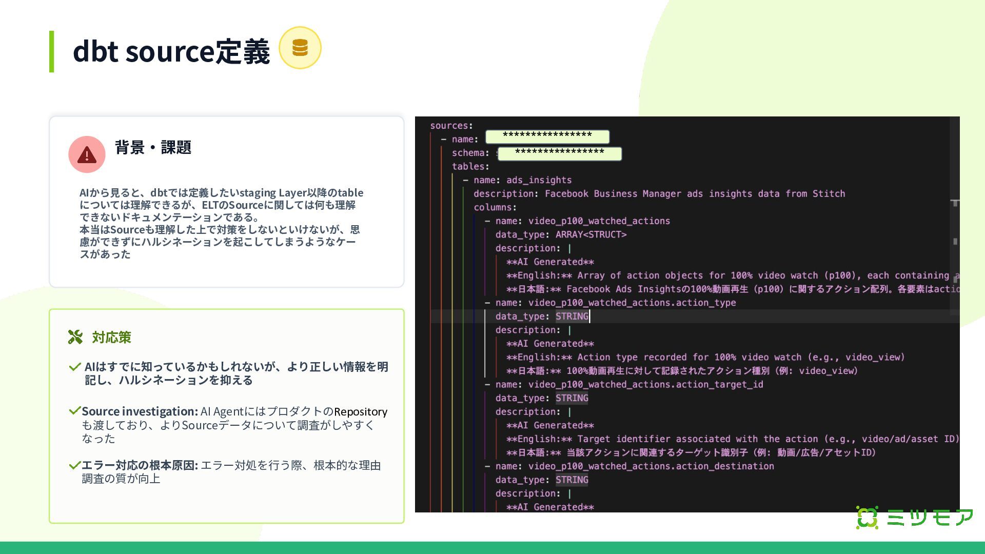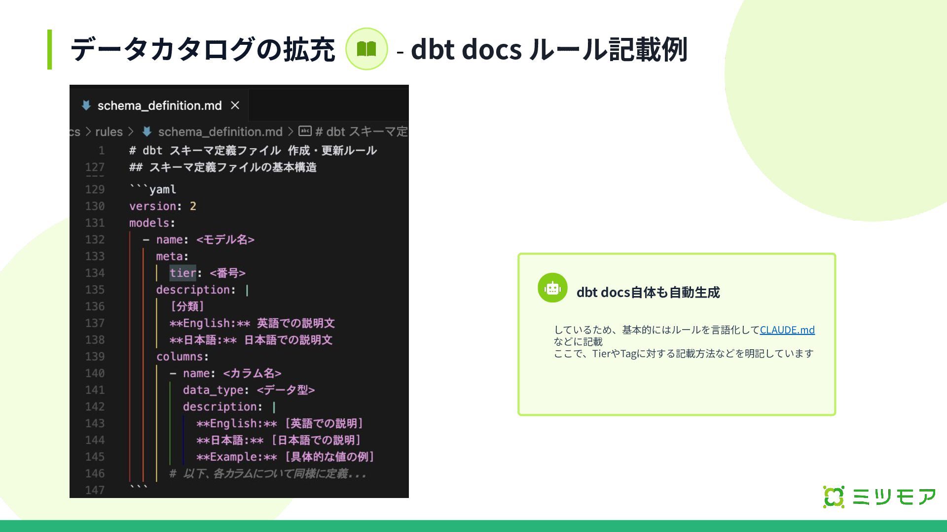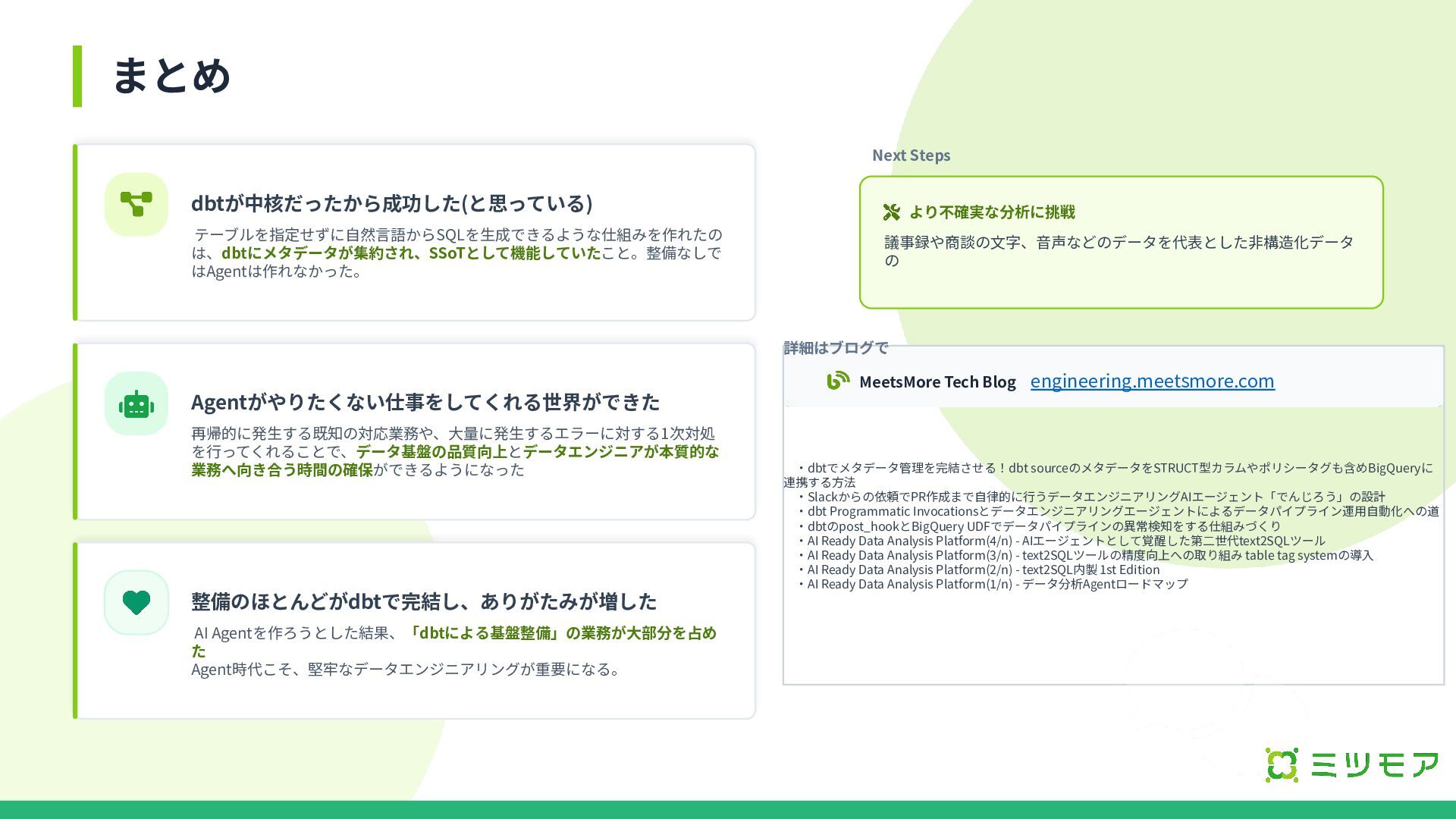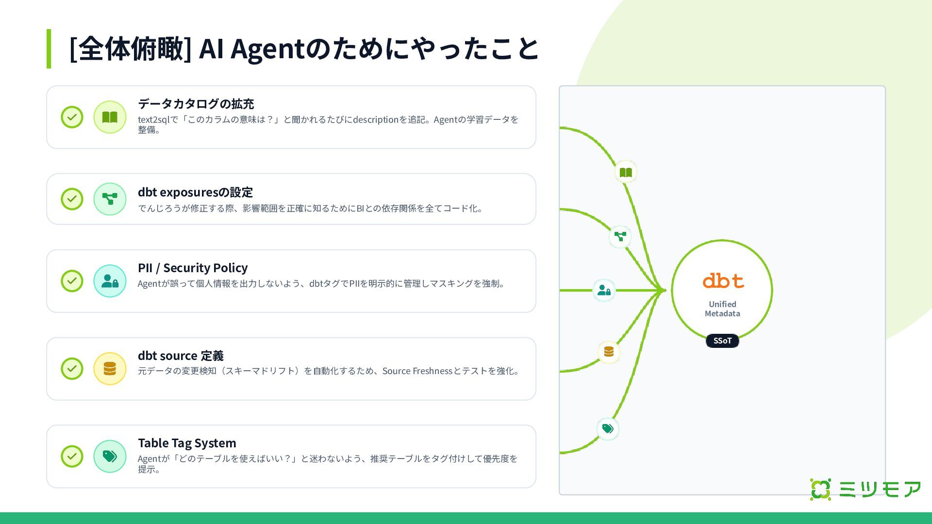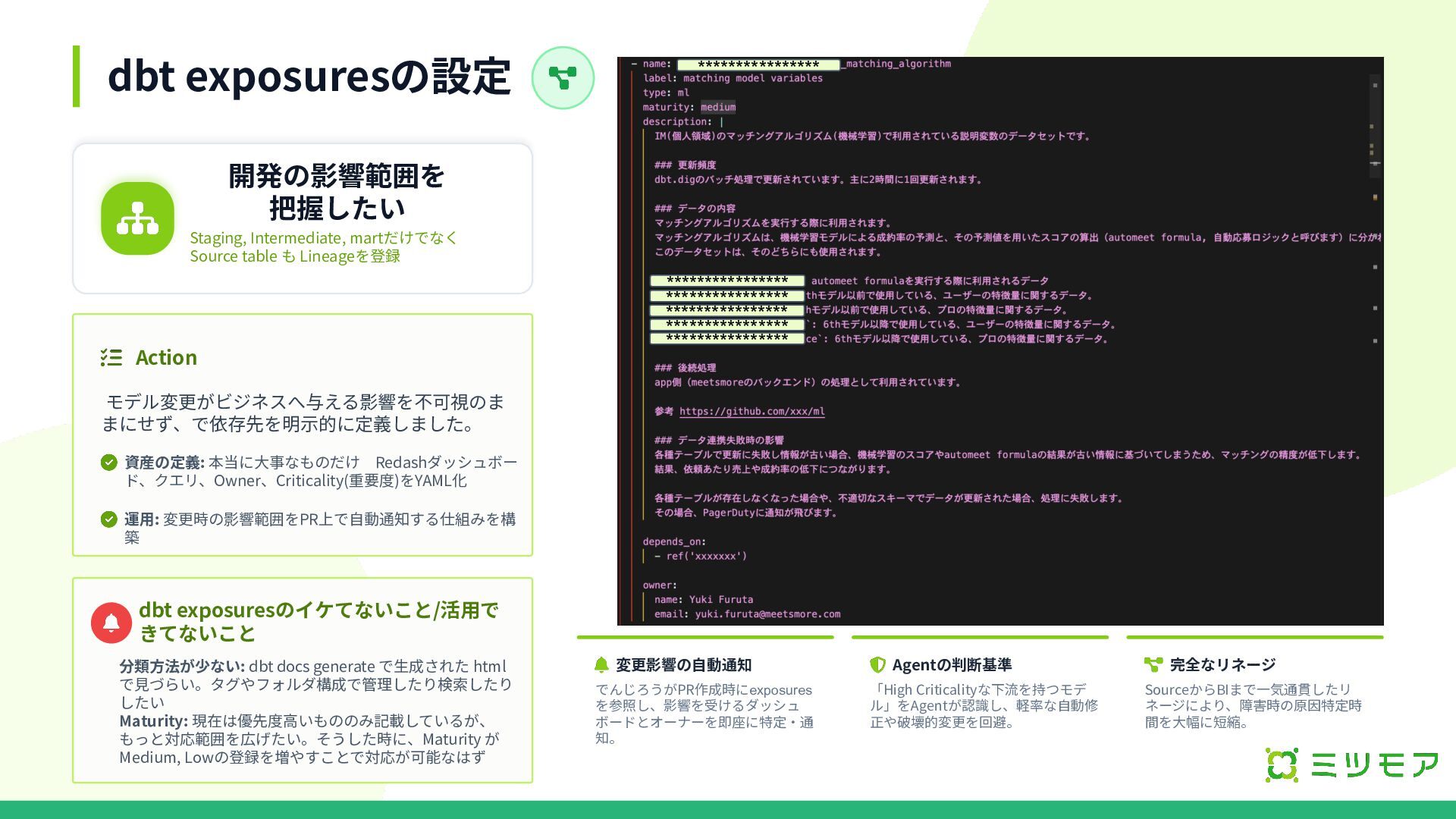 Lineageを登録 変更影響の⾃動通知 でんじろうがPR作成時にexposures を参照し、影響を受けるダッシュ ボードとオーナーを即座に特定‧通 知。 Agentの判断基準 「High Criticalityな下流を持つモデ ル」をAgentが認識し、軽率な⾃動修 正や破壊的変更を回避。 完全なリネージ SourceからBIまで⼀気通貫したリ ネージにより、障害時の原因特定時 間を⼤幅に短縮。 Action モデル変更がビジネスへ与える影響を不可視のま まにせず、で依存先を明⽰的に定義しました。 資産の定義: 本当に⼤事なものだけ Redashダッシュボー ド、クエリ、Owner、Criticality(重要度)をYAML化 運⽤: 変更時の影響範囲をPR上で⾃動通知する仕組みを構 築 dbt exposuresのイケてないこと/活⽤で きてないこと 分類⽅法が少ない: dbt docs generate で⽣成された html で⾒づらい。タグやフォルダ構成で管理したり検索したり したい Maturity: 現在は優先度⾼いもののみ記載しているが、 もっと対応範囲を広げたい。そうした時に、Maturity が Medium, Lowの登録を増やすことで対応が可能なはず **************** **************** **************** **************** **************** ****************