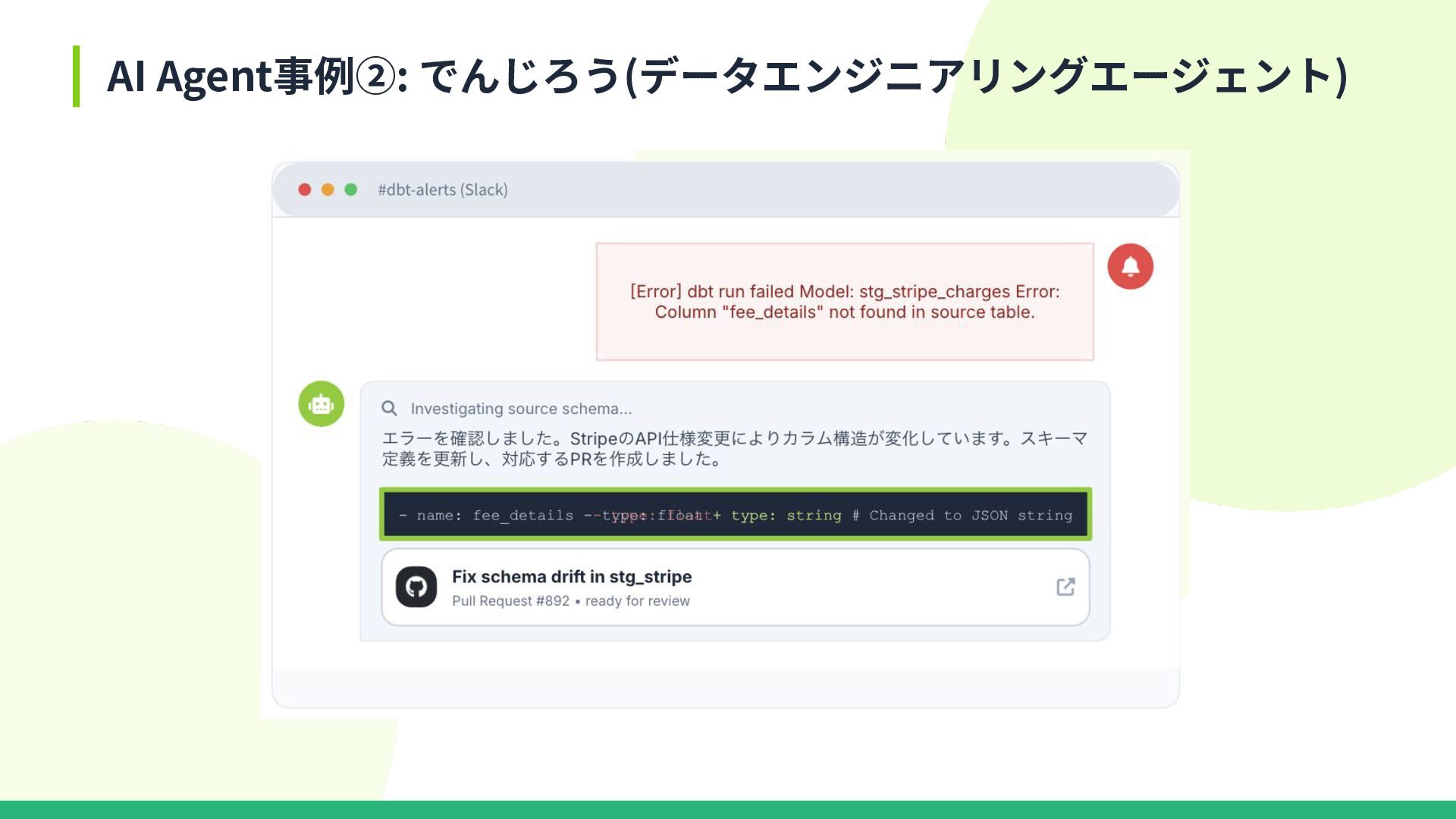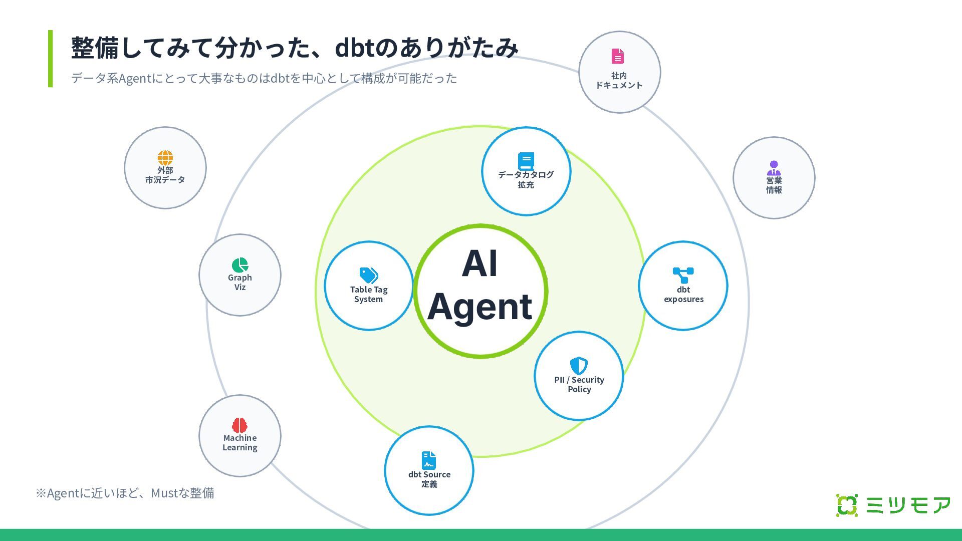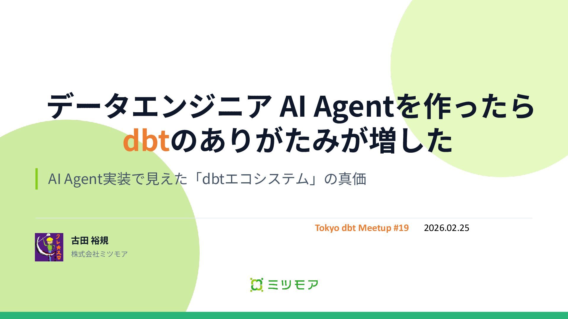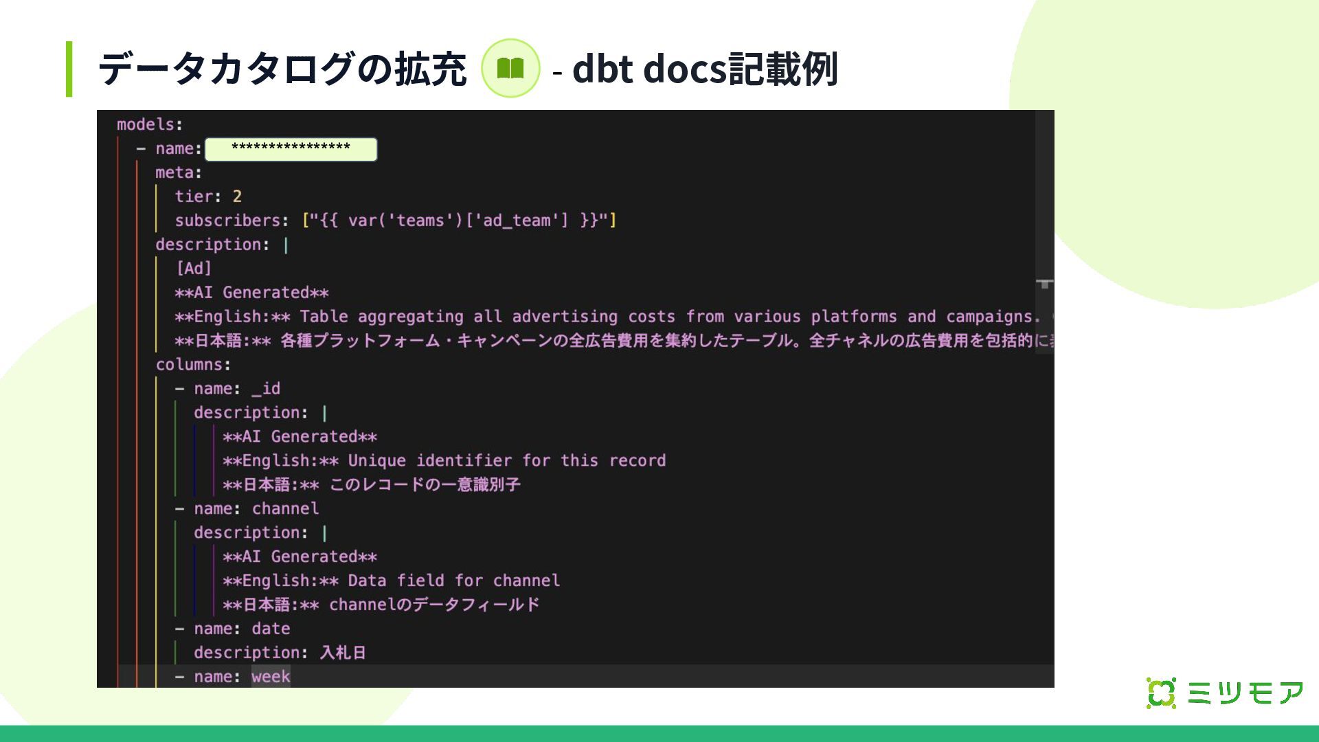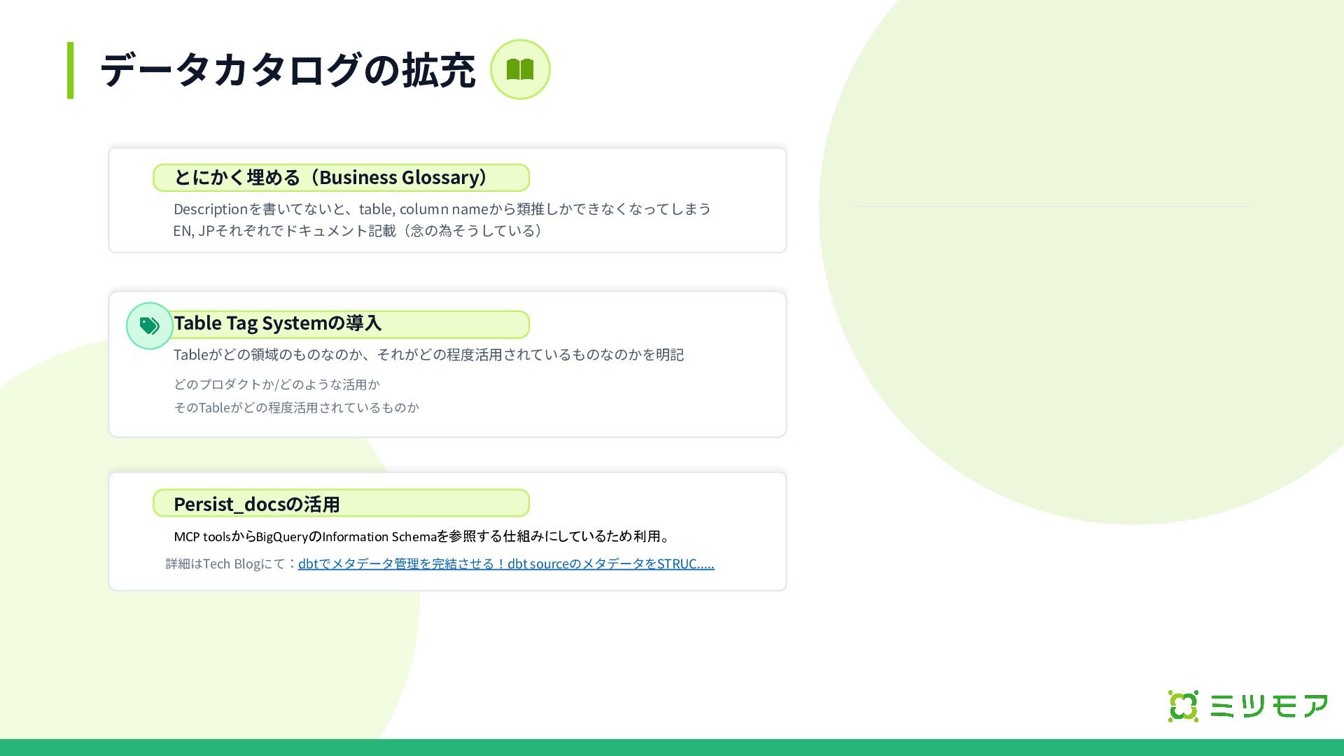 Lineageを登録 変更影響の⾃動通知 でんじろうがPR作成時にexposures を参照し、影響を受けるダッシュ ボードとオーナーを即座に特定‧通 知。 Agentの判断基準 「High Criticalityな下流を持つモデ ル」をAgentが認識し、軽率な⾃動修 正や破壊的変更を回避。 完全なリネージ SourceからBIまで⼀気通貫したリ ネージにより、障害時の原因特定時 間を⼤幅に短縮。 Action モデル変更がビジネスへ与える影響を不可視のま まにせず、で依存先を明⽰的に定義しました。 資産の定義: 本当に⼤事なものだけ Redashダッシュボー ド、クエリ、Owner、Criticality(重要度)をYAML化 運⽤: 変更時の影響範囲をPR上で⾃動通知する仕組みを構 築 dbt exposuresのイケてないこと/活⽤で きてないこと 分類⽅法が少ない: dbt docs generate で⽣成された html で⾒づらい。タグやフォルダ構成で管理したり検索したり したい Maturity: 現在は優先度⾼いもののみ記載しているが、 もっと対応範囲を広げたい。そうした時に、Maturity が Medium, Lowの登録を増やすことで対応が可能なはず **************** **************** **************** **************** **************** ****************