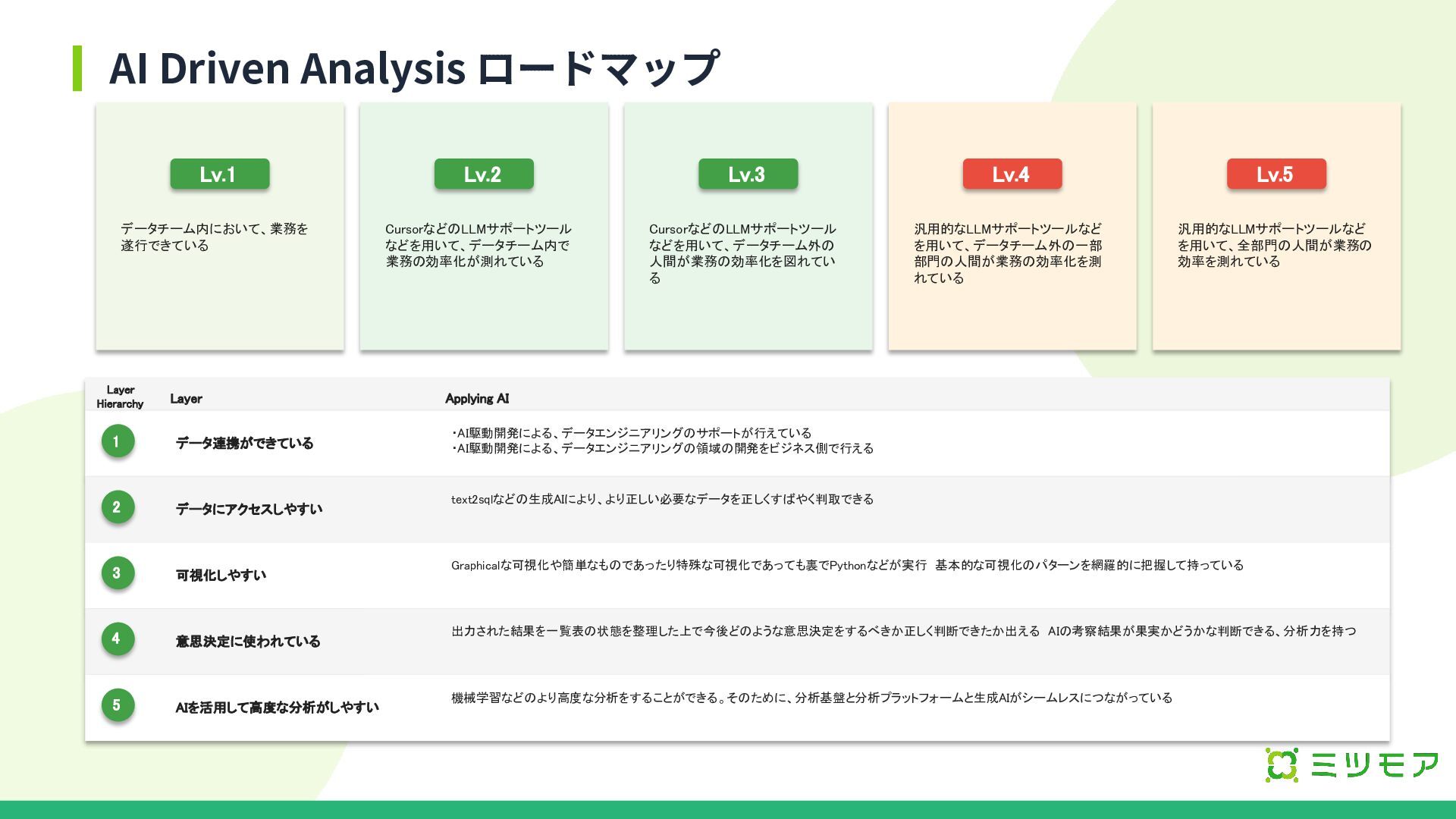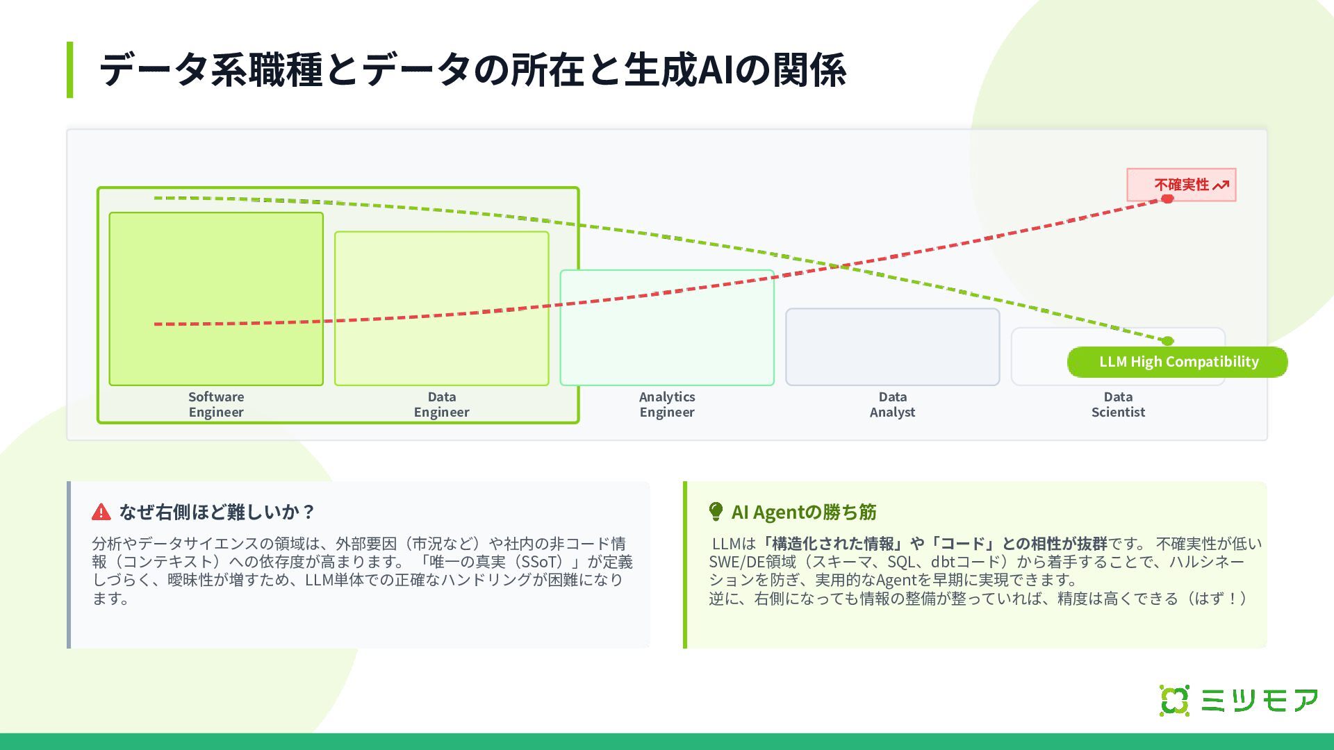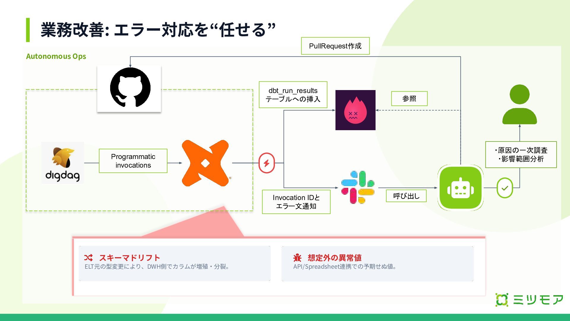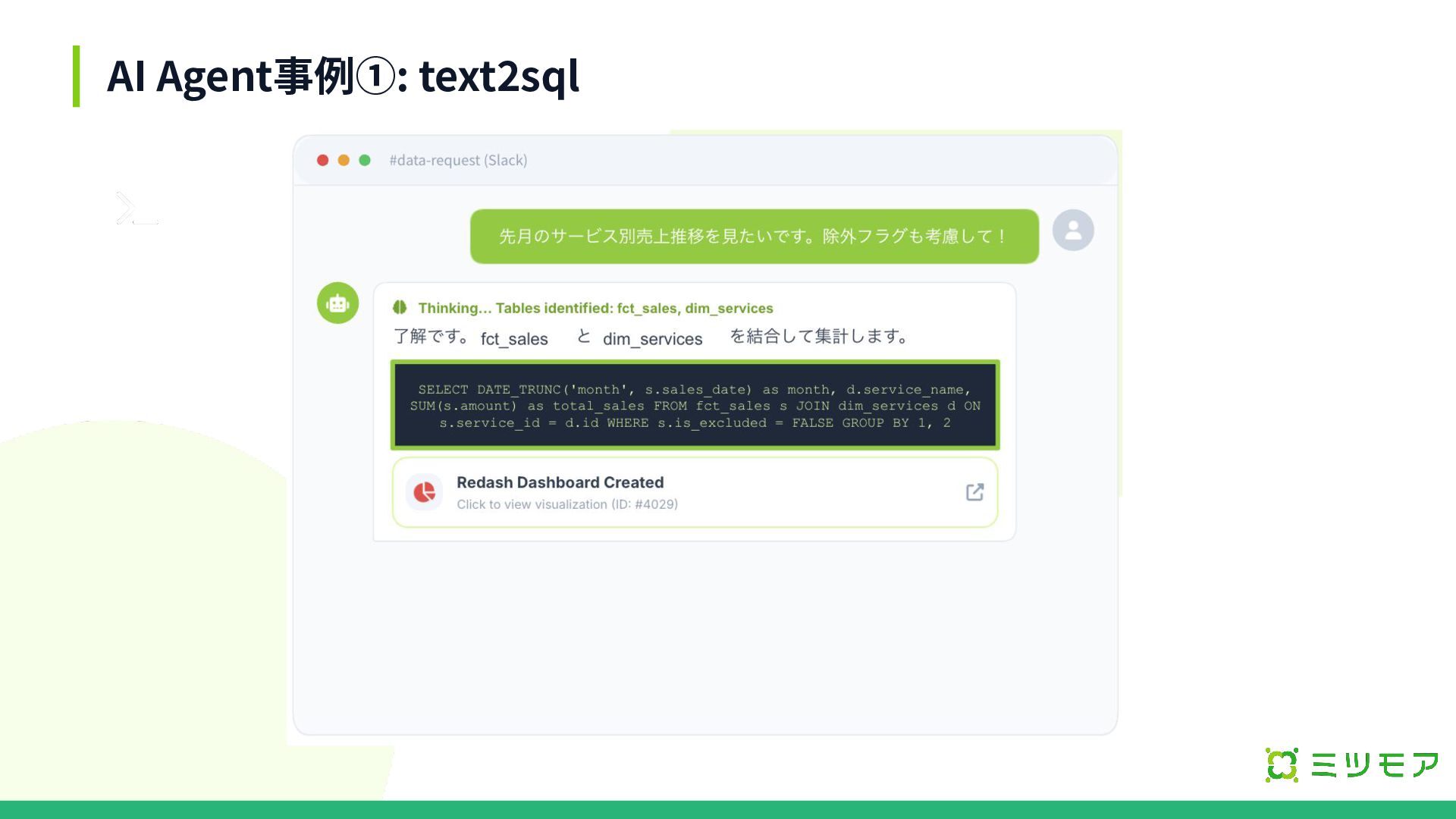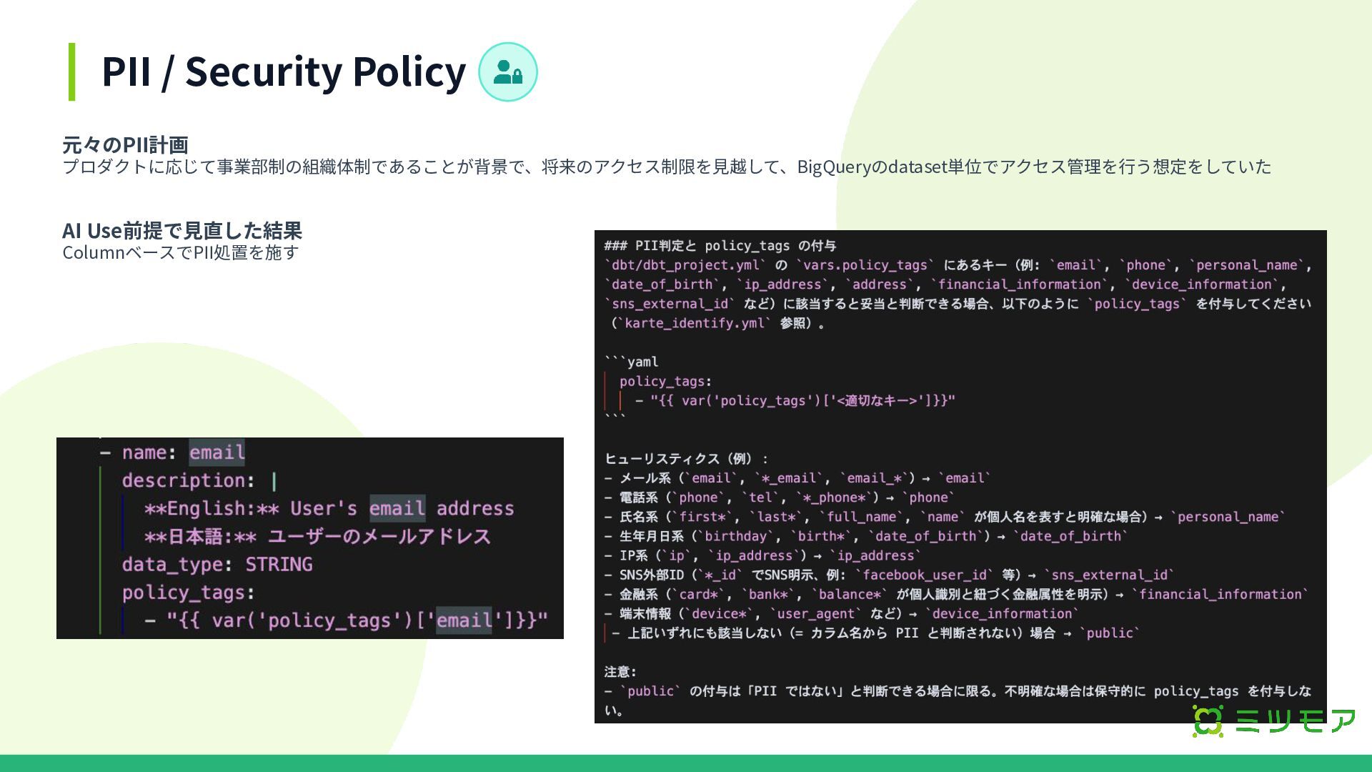 Lineageを登録 変更影響の⾃動通知 でんじろうがPR作成時にexposures を参照し、影響を受けるダッシュ ボードとオーナーを即座に特定‧通 知。 Agentの判断基準 「High Criticalityな下流を持つモデ ル」をAgentが認識し、軽率な⾃動修 正や破壊的変更を回避。 完全なリネージ SourceからBIまで⼀気通貫したリ ネージにより、障害時の原因特定時 間を⼤幅に短縮。 Action モデル変更がビジネスへ与える影響を不可視のま まにせず、で依存先を明⽰的に定義しました。 資産の定義: 本当に⼤事なものだけ Redashダッシュボー ド、クエリ、Owner、Criticality(重要度)をYAML化 運⽤: 変更時の影響範囲をPR上で⾃動通知する仕組みを構 築 dbt exposuresのイケてないこと/活⽤で きてないこと 分類⽅法が少ない: dbt docs generate で⽣成された html で⾒づらい。タグやフォルダ構成で管理したり検索したり したい Maturity: 現在は優先度⾼いもののみ記載しているが、 もっと対応範囲を広げたい。そうした時に、Maturity が Medium, Lowの登録を増やすことで対応が可能なはず **************** **************** **************** **************** **************** ****************
