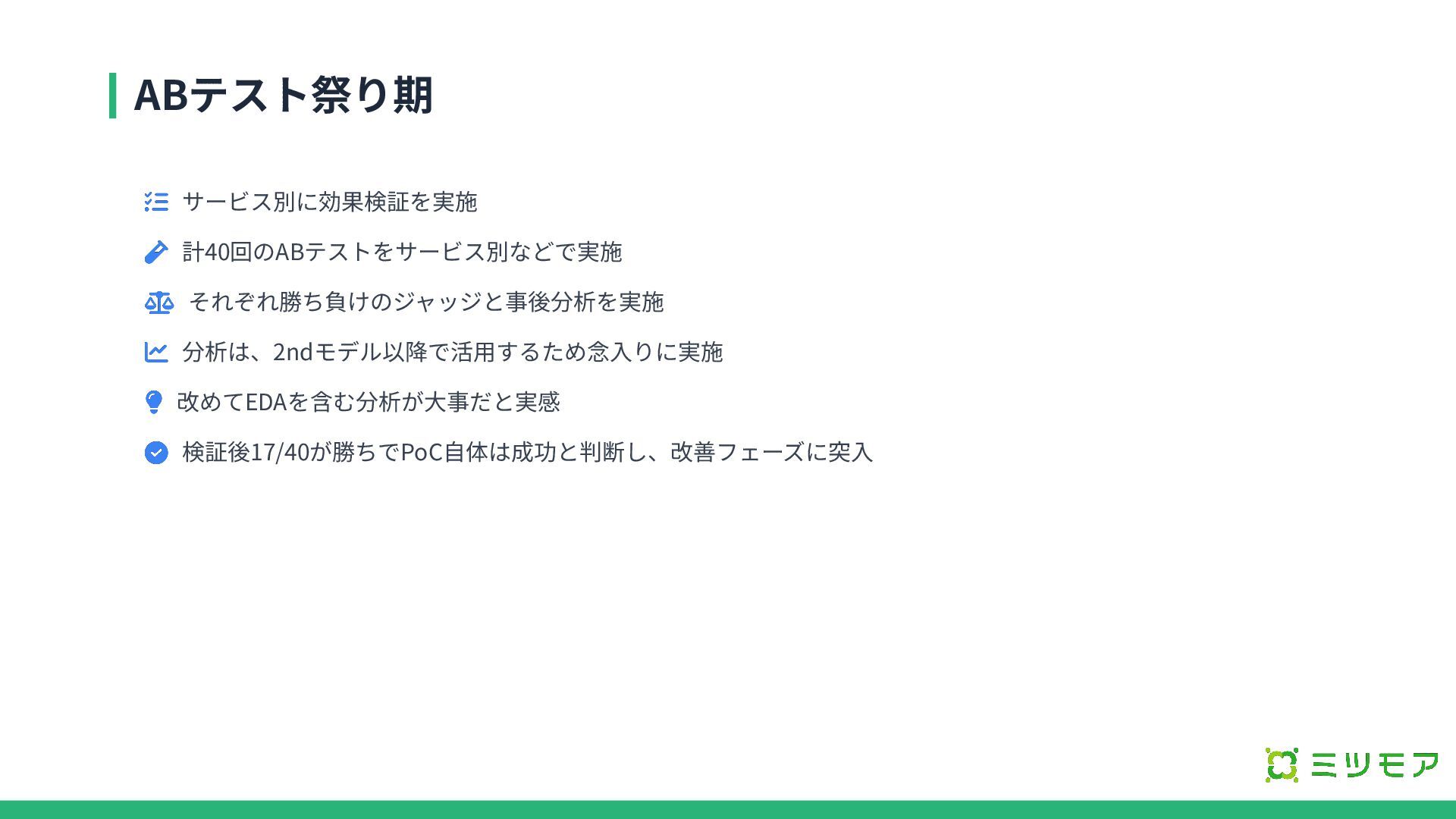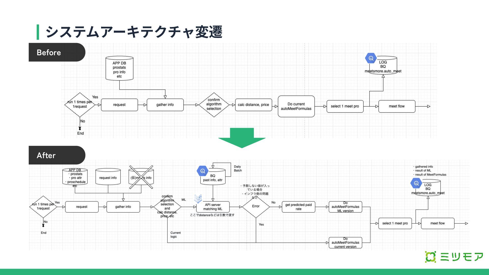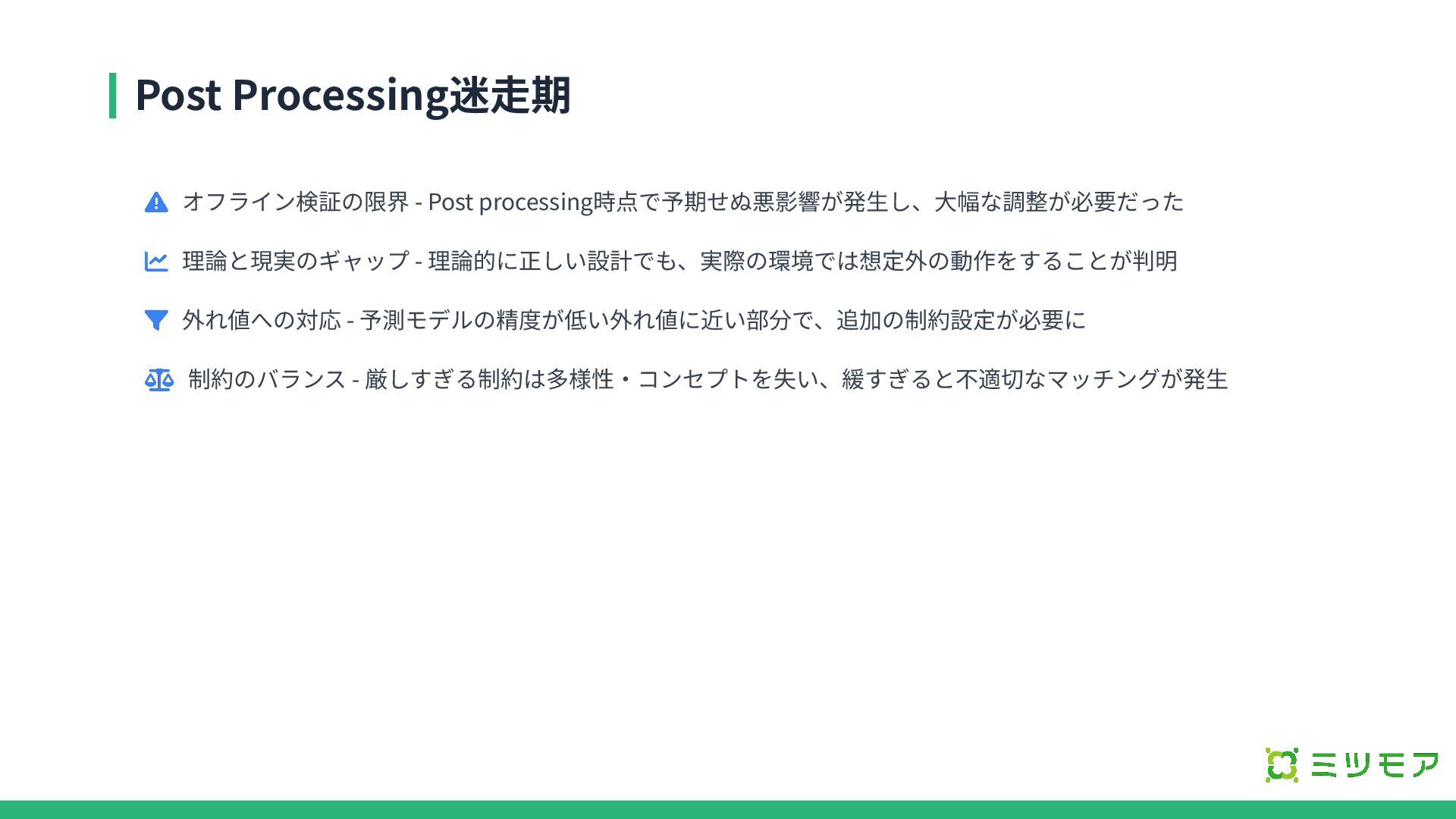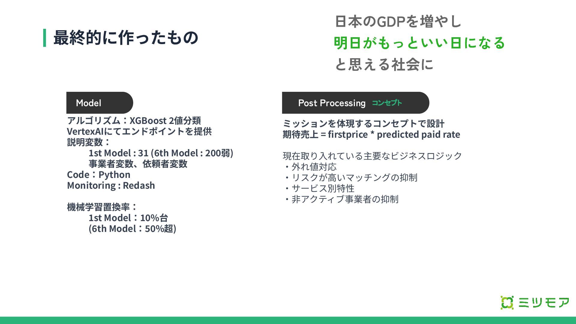 Model : 200弱) 事業者変数、依頼者変数 Code:Python Monitoring : Redash 機械学習置換率: 1st Model:10%台 (6th Model:50%超) ミッションを体現するコンセプトで設計 期待売上 = firstprice * predicted paid rate 現在取り⼊れている主要なビジネスロジック ‧外れ値対応 ‧リスクが⾼いマッチングの抑制 ‧サービス別特性 ‧⾮アクティブ事業者の抑制 Post Processing コンセプト 日本のGDPを増やし 明日がもっといい日になる と思える社会に Model