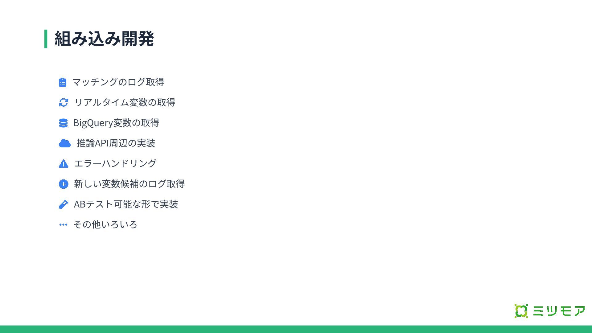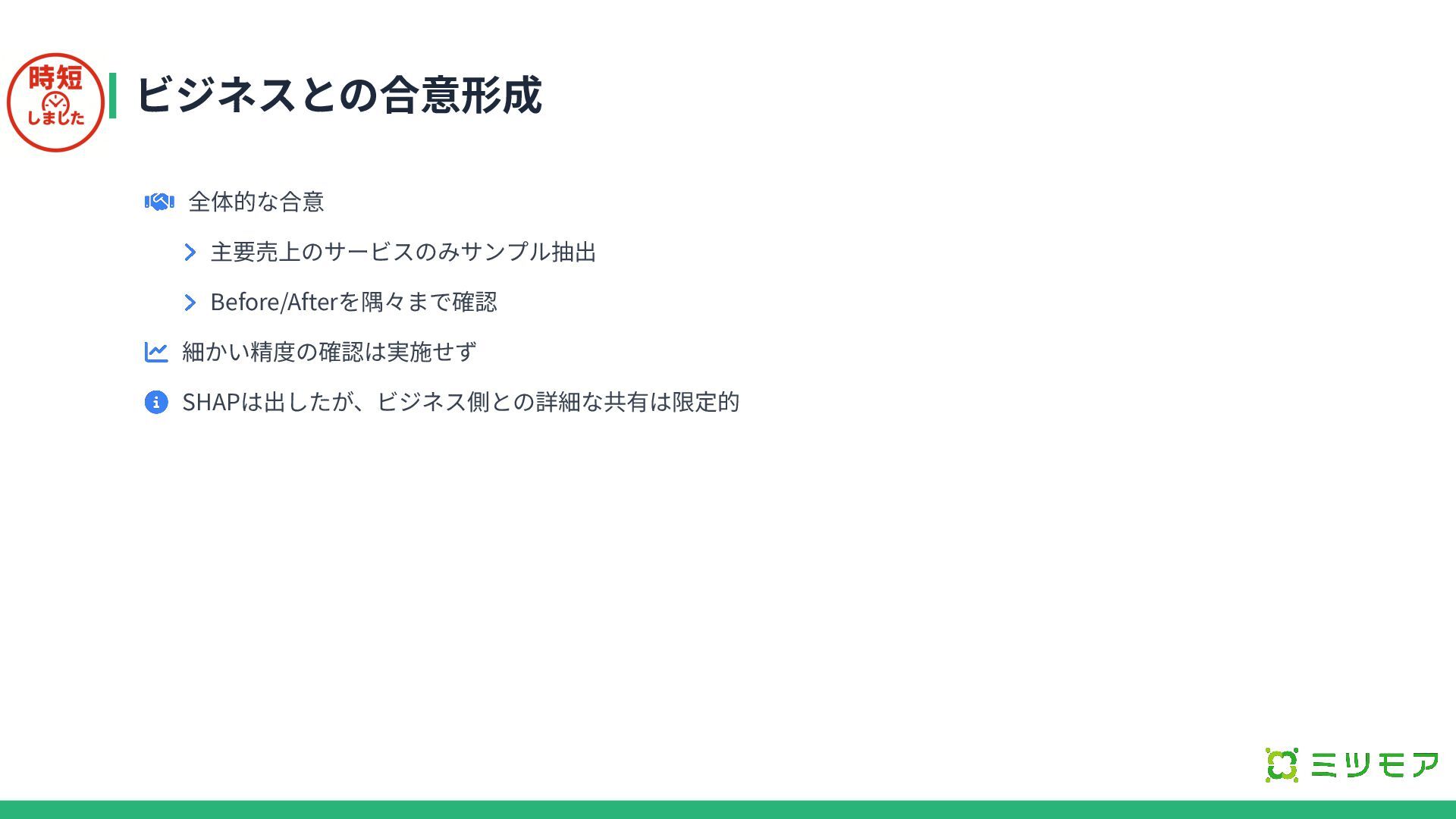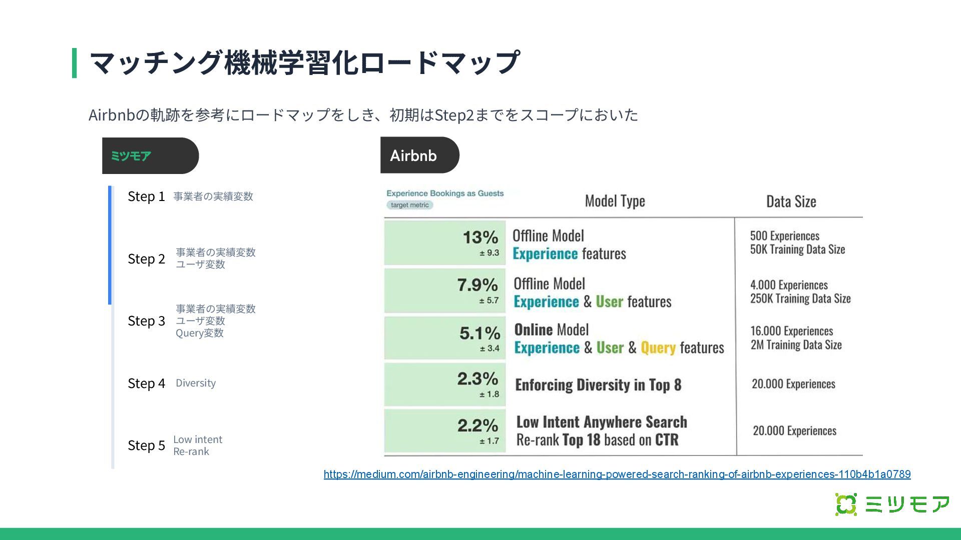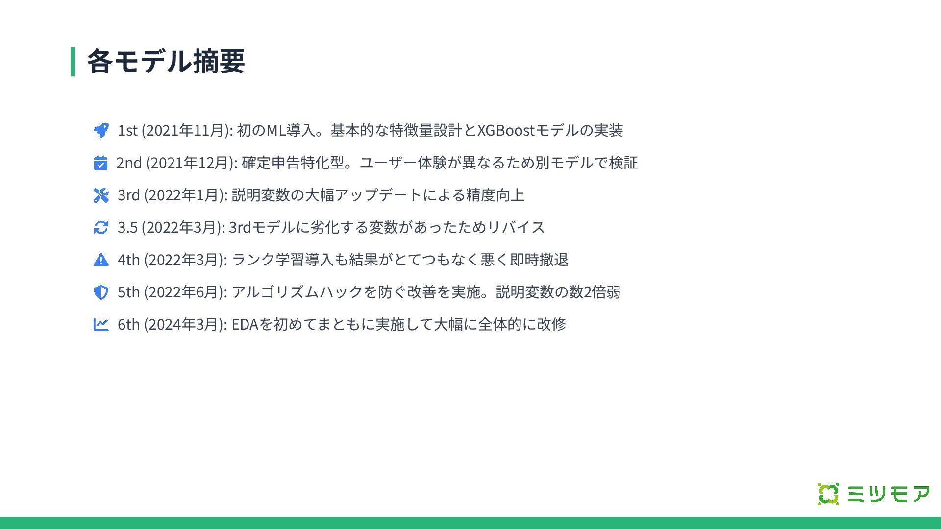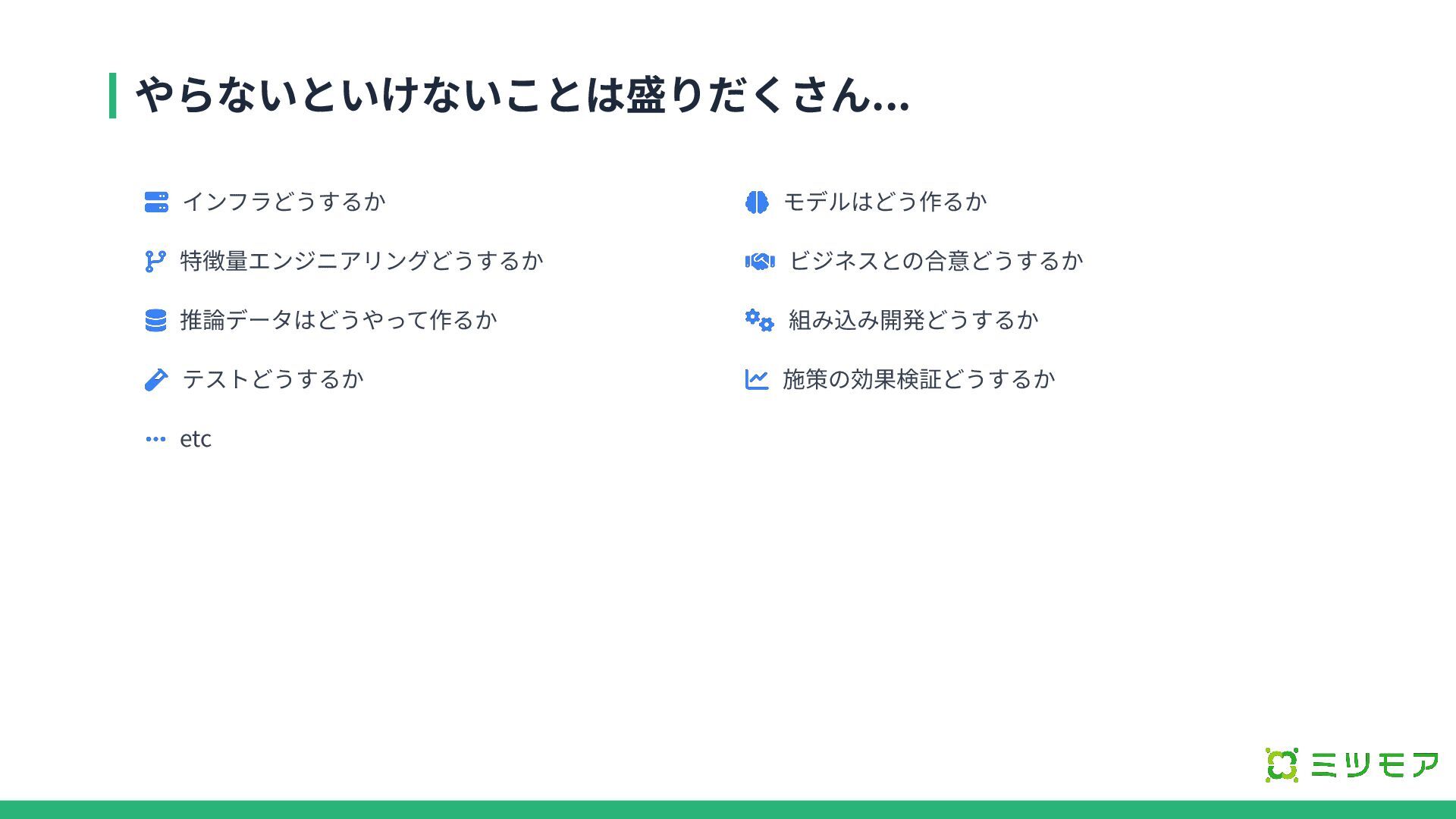 Model : 200弱) 事業者変数、依頼者変数 Code:Python Monitoring : Redash 機械学習置換率: 1st Model:10%台 (6th Model:50%超) ミッションを体現するコンセプトで設計 期待売上 = firstprice * predicted paid rate 現在取り⼊れている主要なビジネスロジック ‧外れ値対応 ‧リスクが⾼いマッチングの抑制 ‧サービス別特性 ‧⾮アクティブ事業者の抑制 Post Processing コンセプト 日本のGDPを増やし 明日がもっといい日になる と思える社会に Model