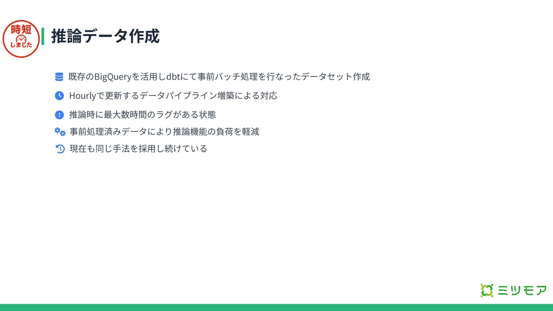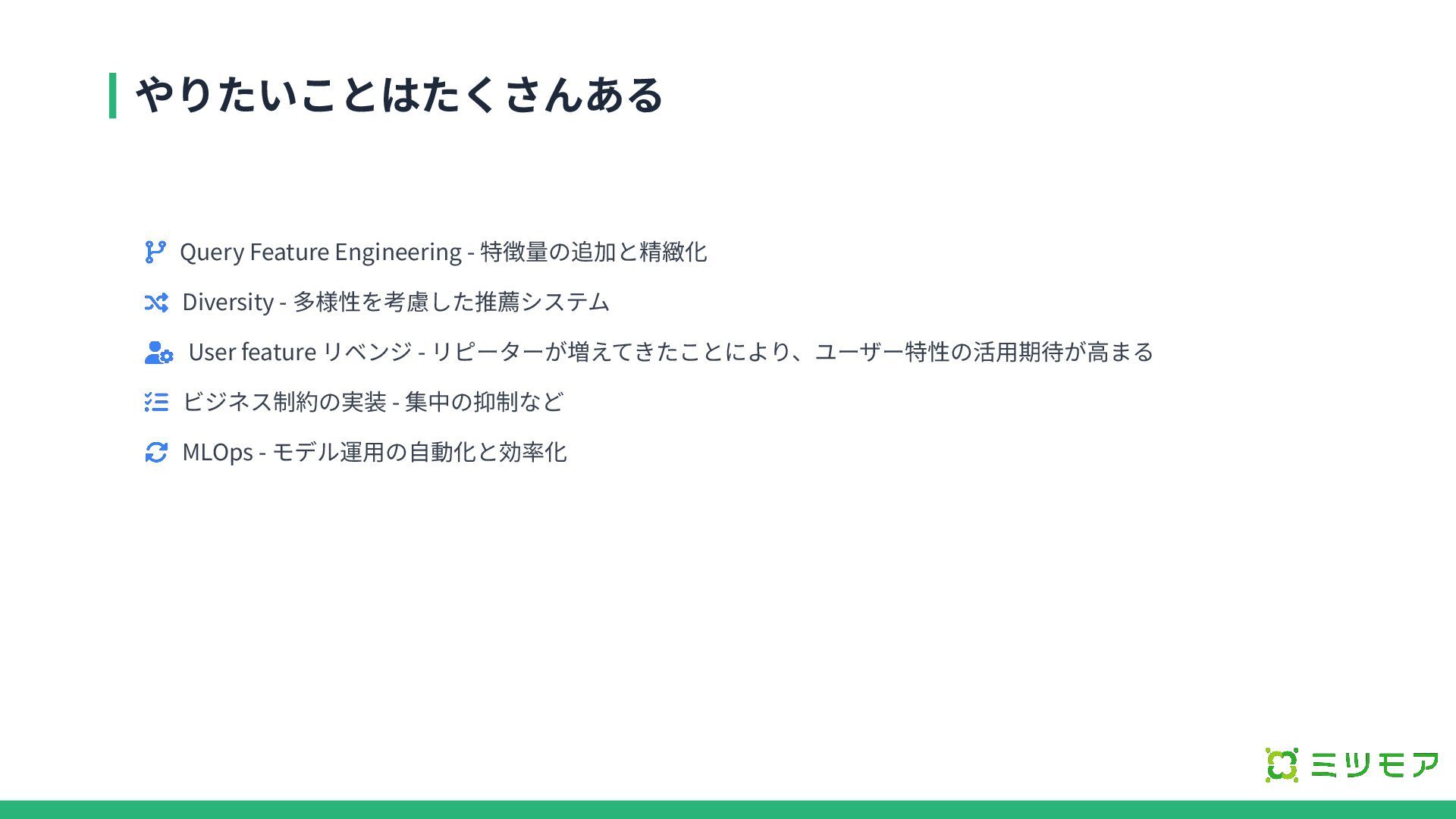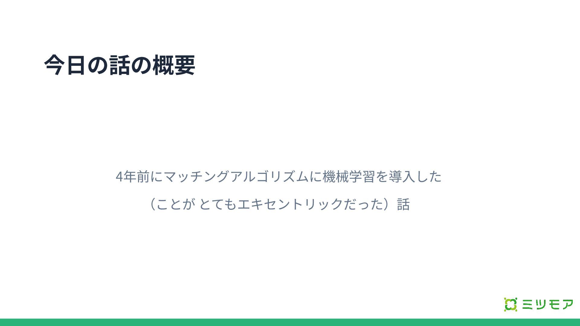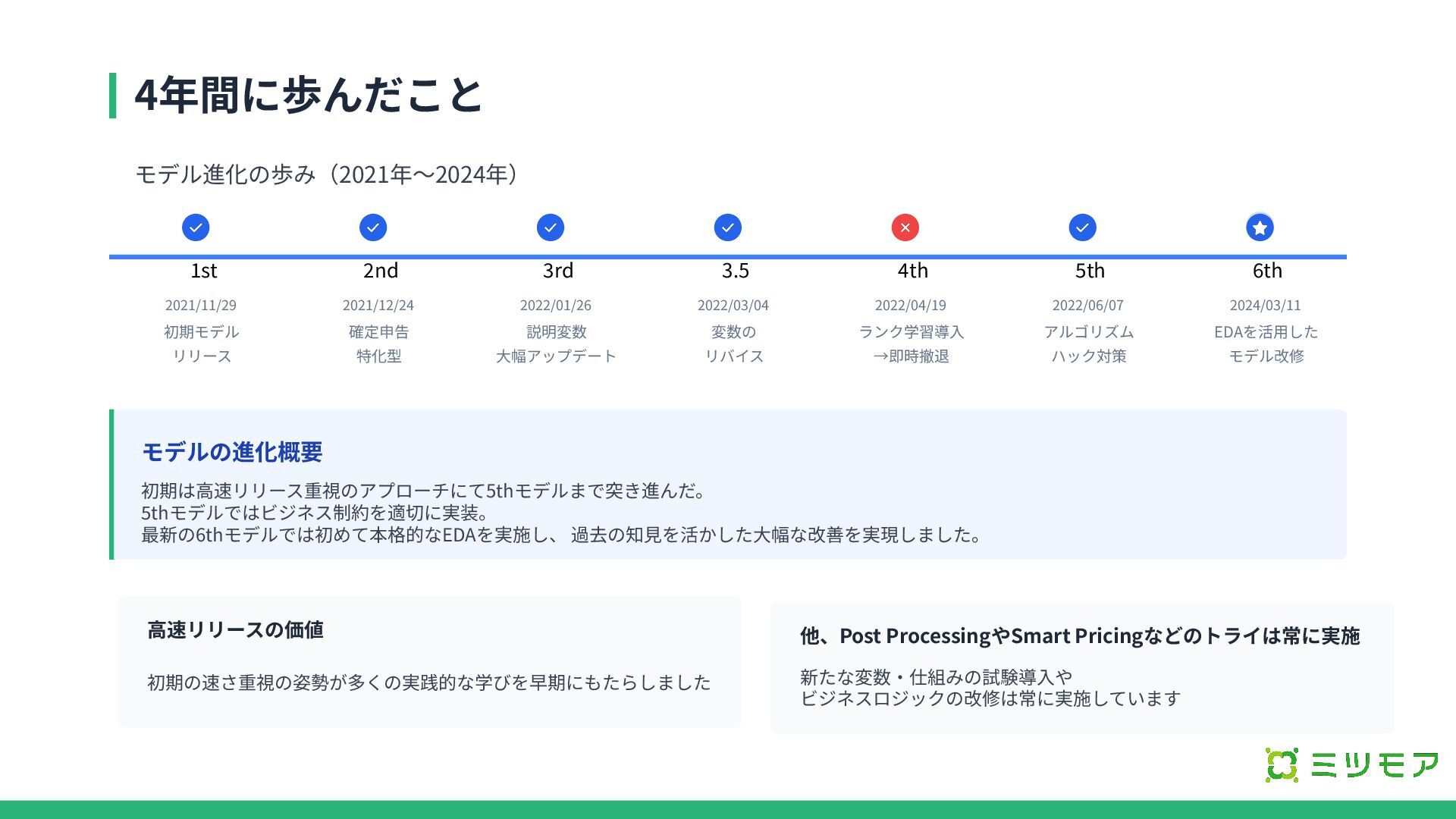 Model : 200弱) 事業者変数、依頼者変数 Code:Python Monitoring : Redash 機械学習置換率: 1st Model:10%台 (6th Model:50%超) ミッションを体現するコンセプトで設計 期待売上 = firstprice * predicted paid rate 現在取り⼊れている主要なビジネスロジック ‧外れ値対応 ‧リスクが⾼いマッチングの抑制 ‧サービス別特性 ‧⾮アクティブ事業者の抑制 Post Processing コンセプト 日本のGDPを増やし 明日がもっといい日になる と思える社会に Model