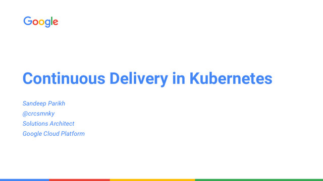 Continuous Delivery in Kubernetes Sandeep Parikh @crcsmnky Solutions Architect Google
