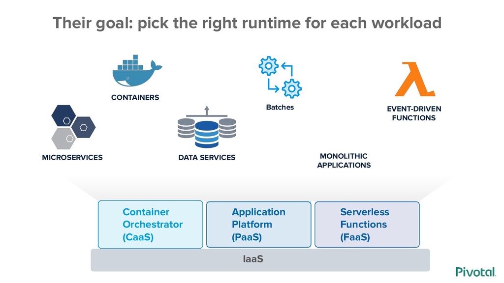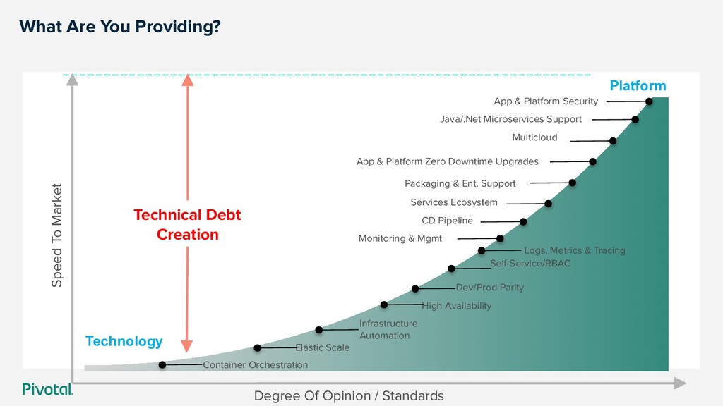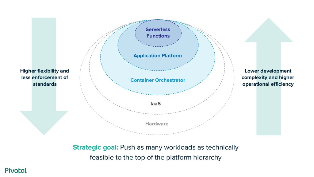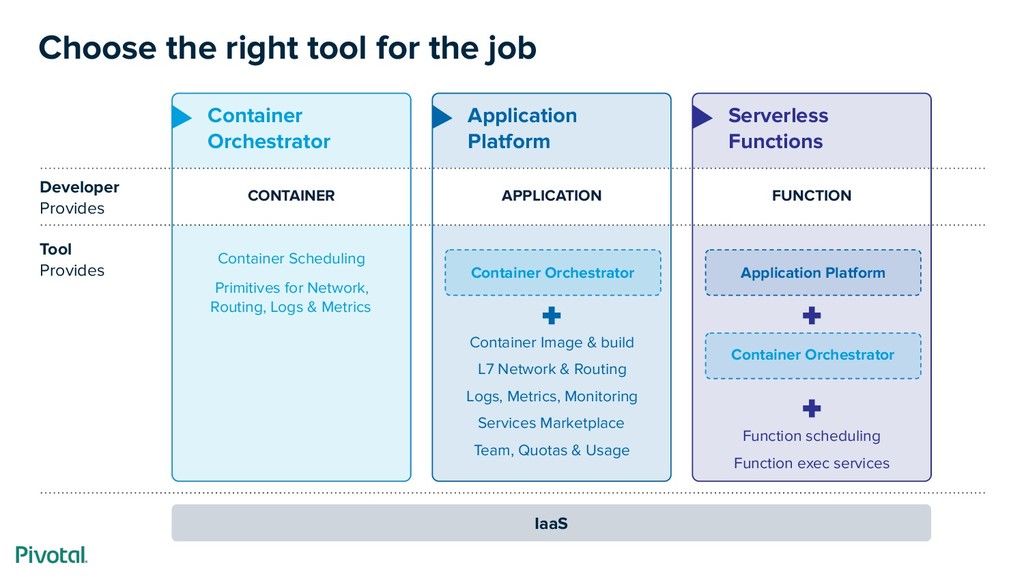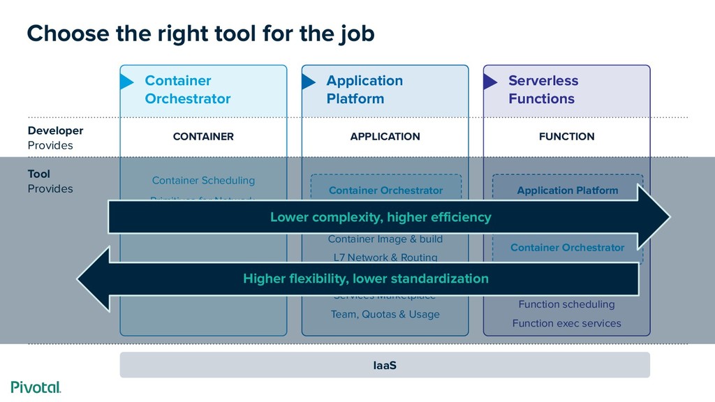Platform APPLICATION Container Orchestrator Serverless Functions FUNCTION IaaS Container Image & build L7 Network & Routing Logs, Metrics, Monitoring Services Marketplace Team, Quotas & Usage Application Platform Container Orchestrator Function scheduling Function exec services Lower complexity, higher efficiency Higher flexibility, lower standardization