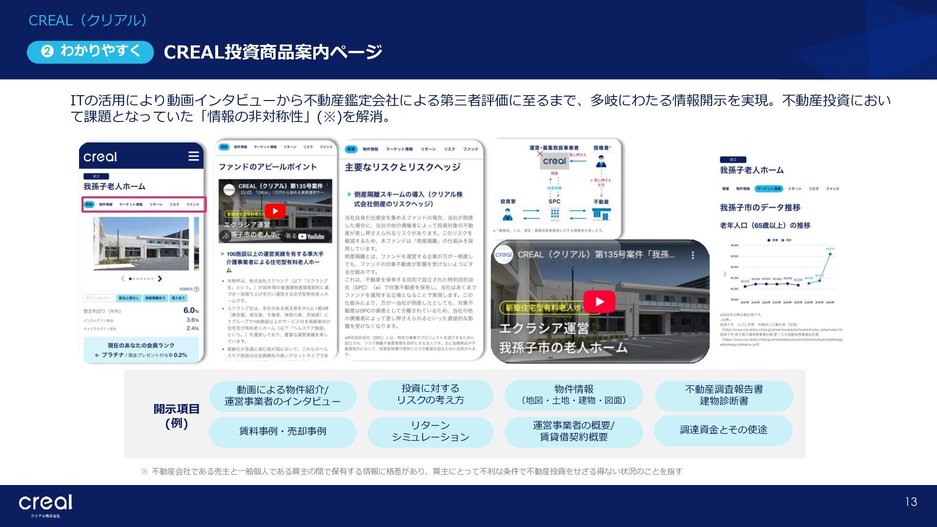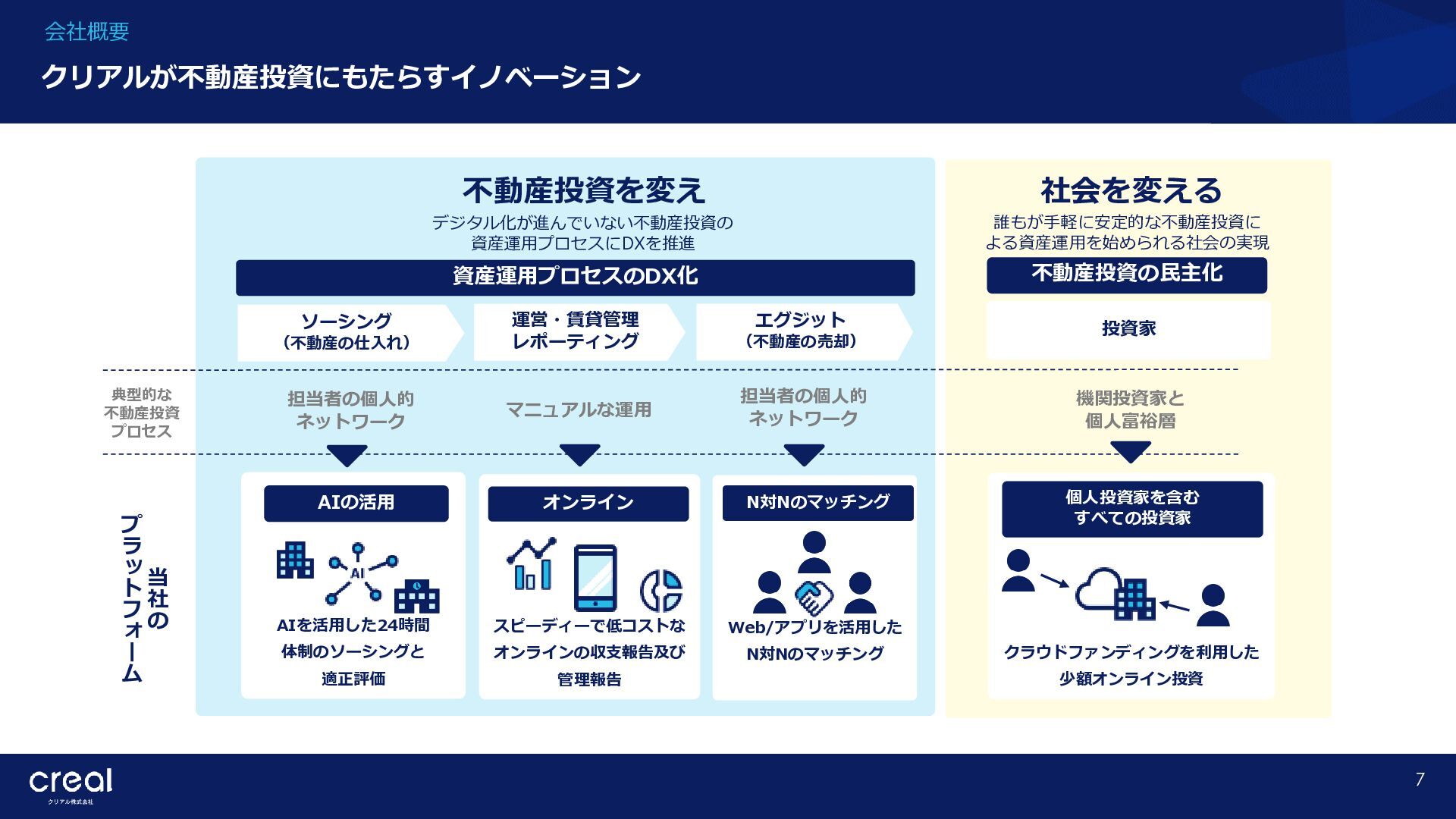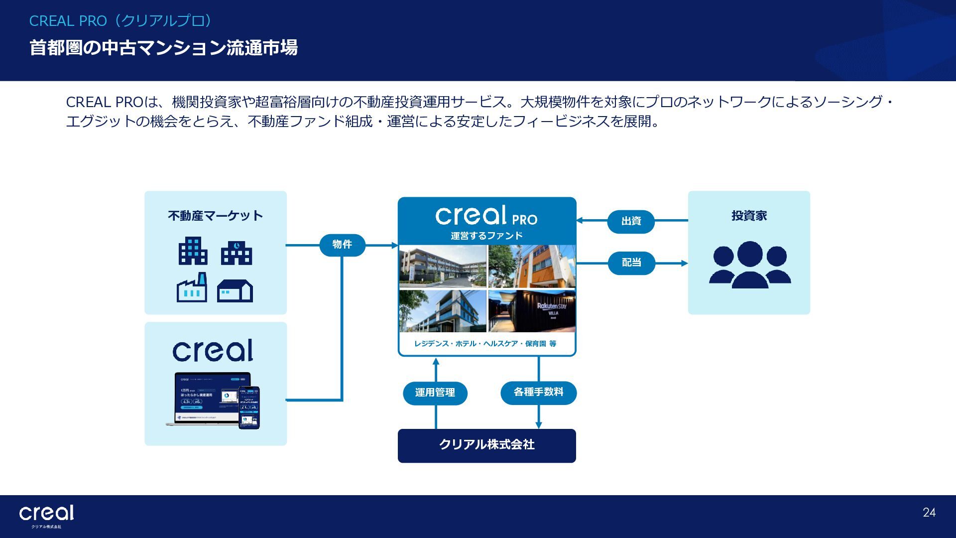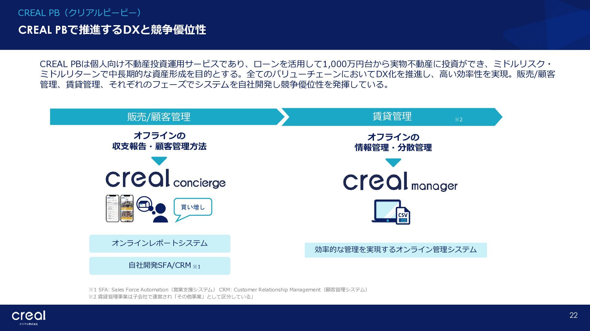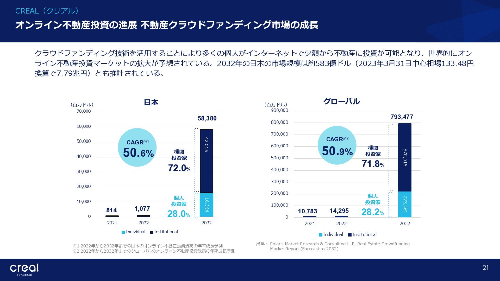 Market Report (Forecast to 2032) ※1 2022年から2032年までの⽇本のオンライン不動産投資残高の年率成長予測 ※2 2022年から2032年までのグローバルのオンライン不動産投資残高の年率成長予測 CAGR※1 50.6% (百万ドル) (百万ドル) 814 1,077 58,380 CAGR※2 50.9% 793,477 14,295 10,783 日本 グローバル 個人 投資家 28.2% 機関 投資家 71.8% 個人 投資家 28.0% 機関 投資家 72.0% オンライン不動産投資の進展 不動産クラウドファンディング市場の成長 CREAL(クリアル) 21 クラウドファンディング技術を活用することにより多くの個人がインターネットで少額から不動産に投資が可能となり、世界的にオン ライン不動産投資マーケットの拡大が予想されている。2032年の⽇本の市場規模は約583億ドル(2023年3⽉31⽇中心相場133.48円 換算で7.79兆円)とも推計されている。