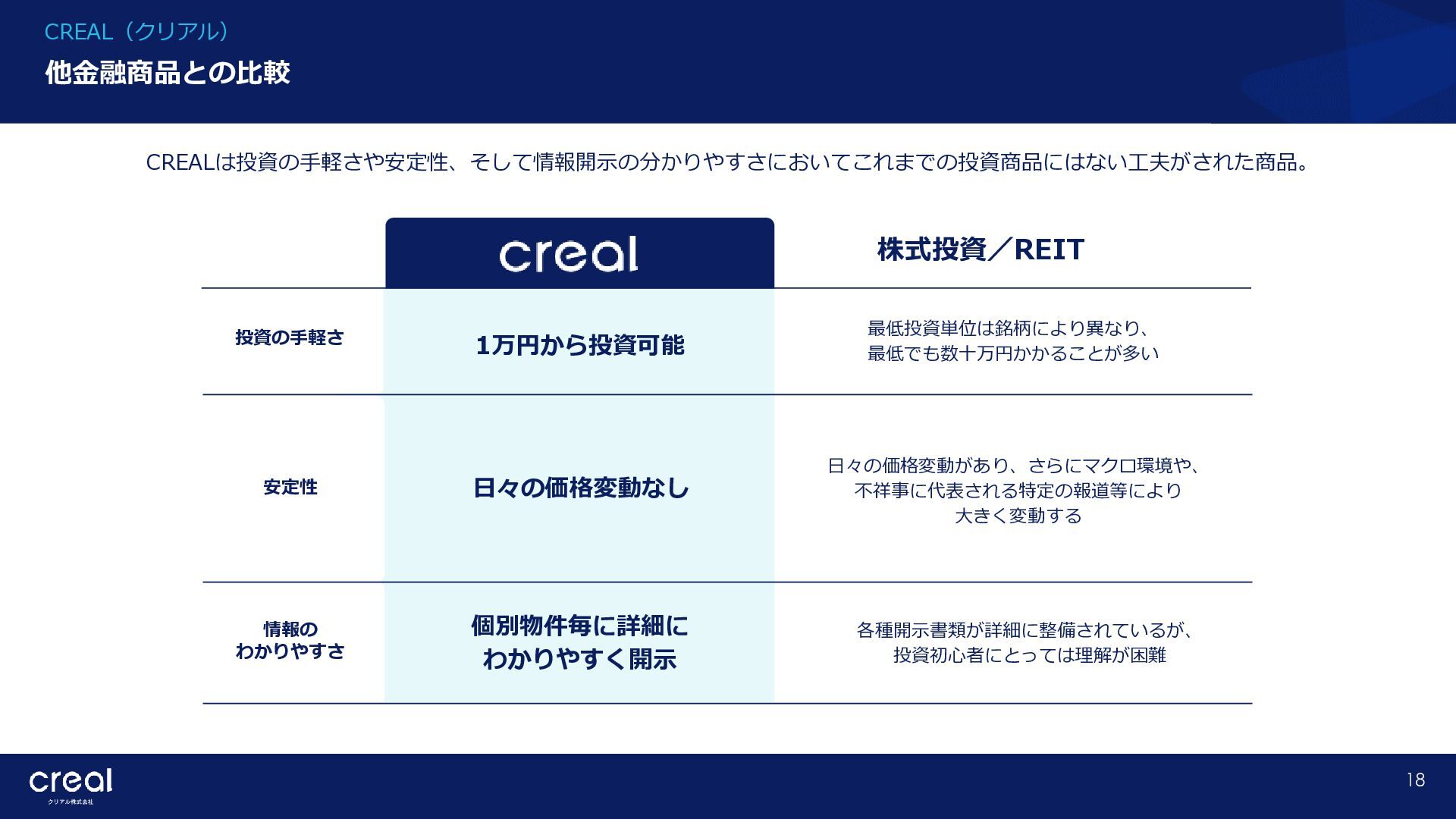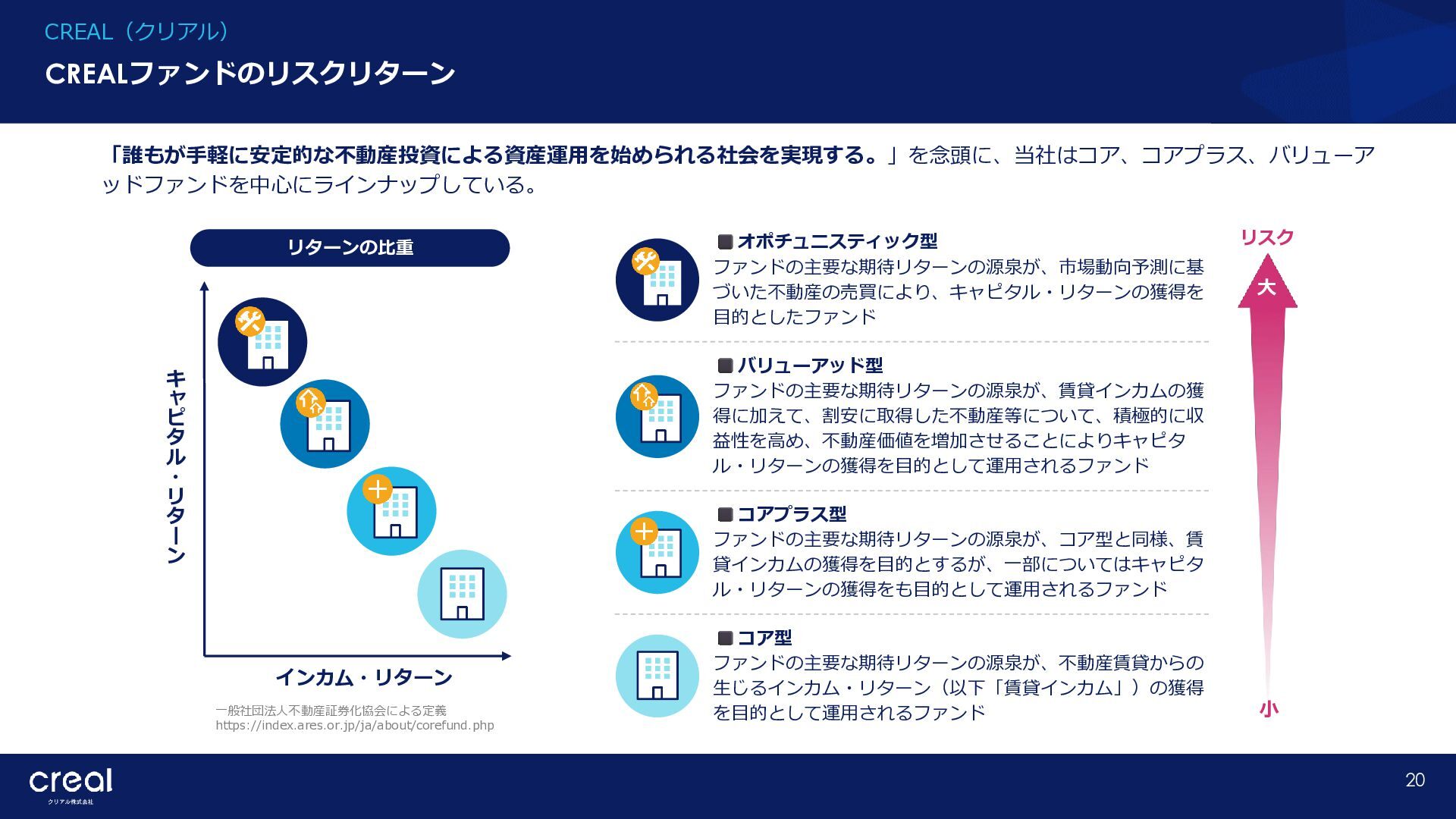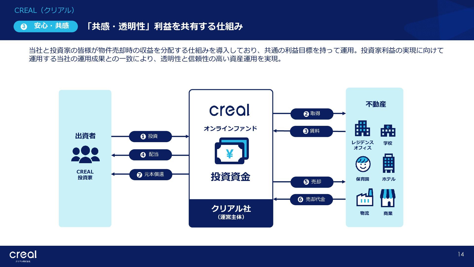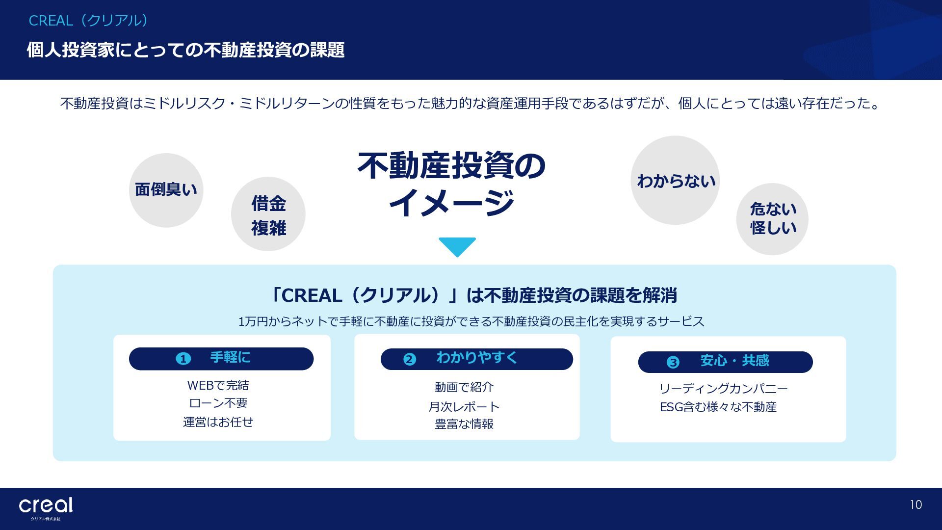 Market Report (Forecast to 2032) ※1 2022年から2032年までの⽇本のオンライン不動産投資残高の年率成長予測 ※2 2022年から2032年までのグローバルのオンライン不動産投資残高の年率成長予測 CAGR※1 50.6% (百万ドル) (百万ドル) 814 1,077 58,380 CAGR※2 50.9% 793,477 14,295 10,783 日本 グローバル 個人 投資家 28.2% 機関 投資家 71.8% 個人 投資家 28.0% 機関 投資家 72.0% オンライン不動産投資の進展 不動産クラウドファンディング市場の成長 CREAL(クリアル) 21 クラウドファンディング技術を活用することにより多くの個人がインターネットで少額から不動産に投資が可能となり、世界的にオン ライン不動産投資マーケットの拡大が予想されている。2032年の⽇本の市場規模は約583億ドル(2023年3⽉31⽇中心相場133.48円 換算で7.79兆円)とも推計されている。