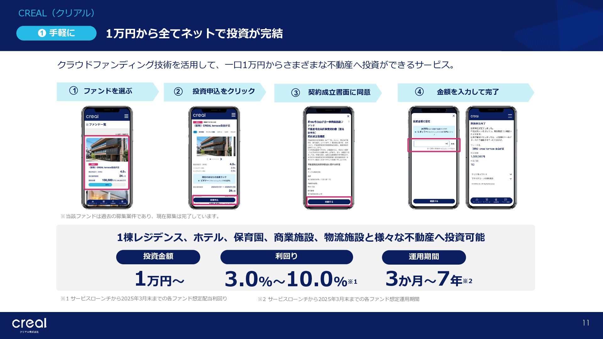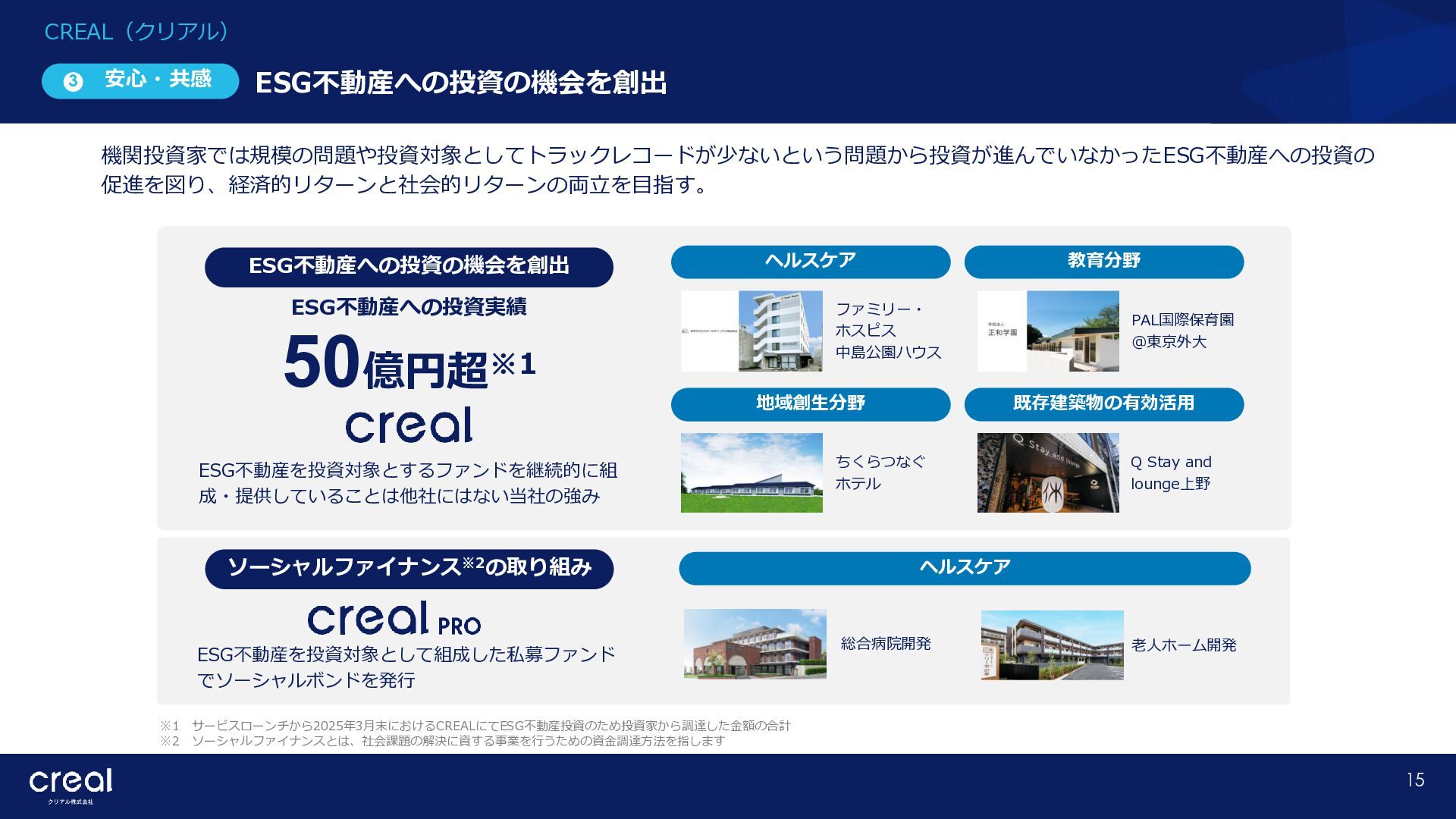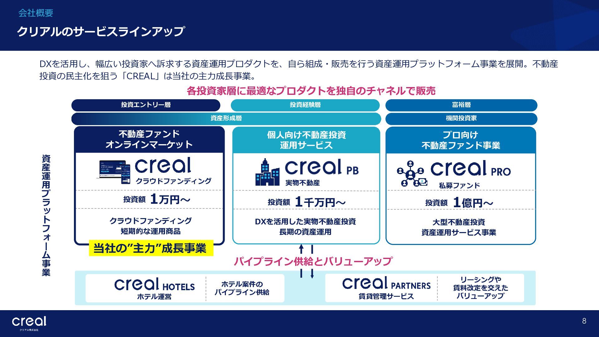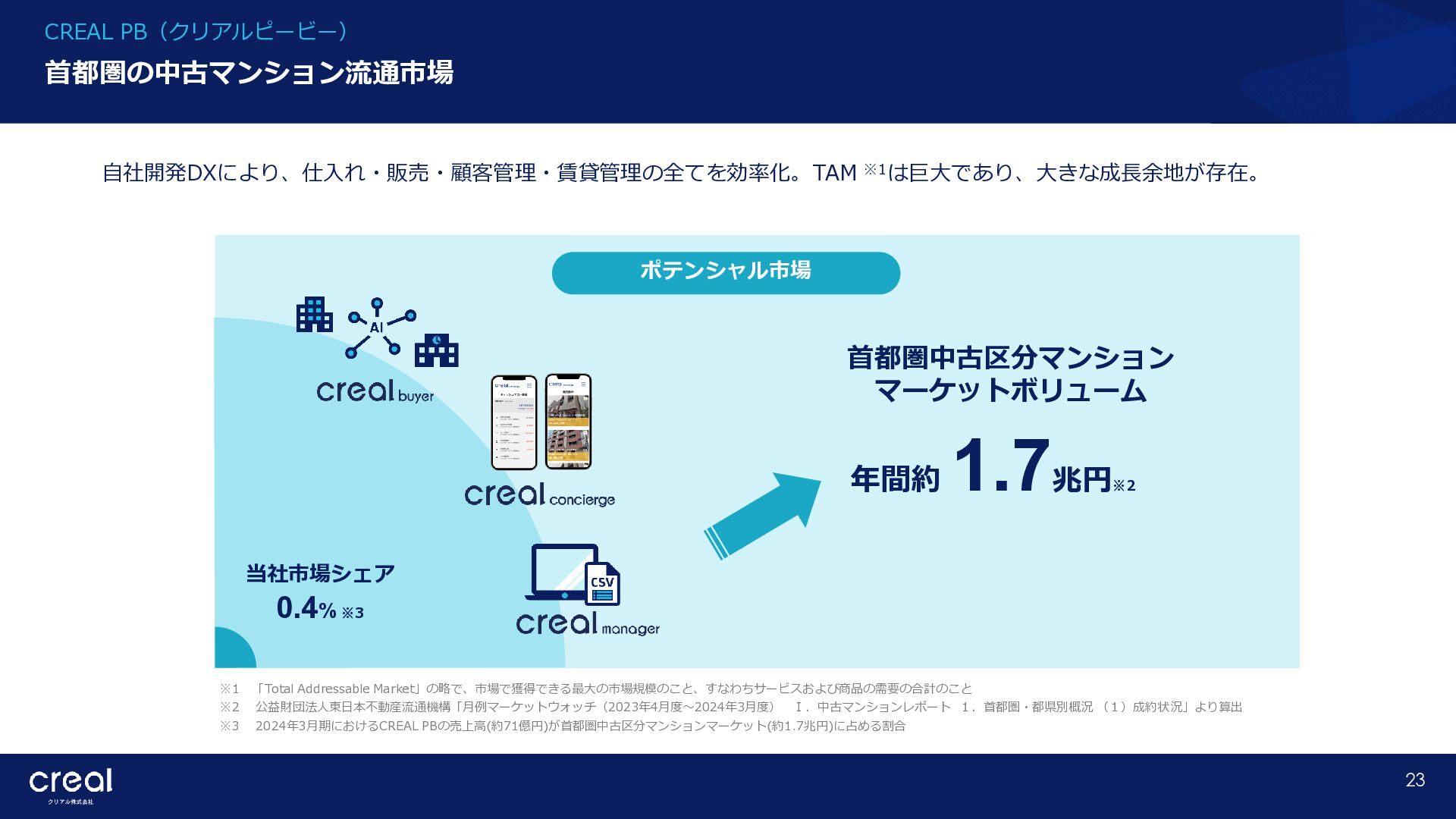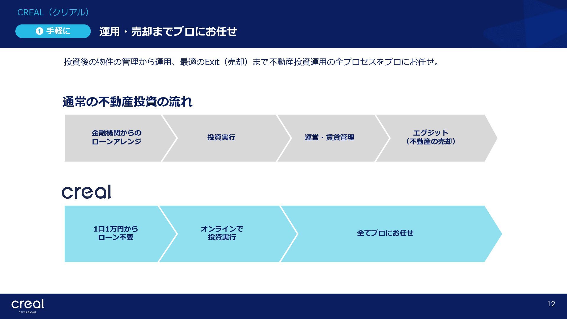 Market Report (Forecast to 2032) ※1 2022年から2032年までの⽇本のオンライン不動産投資残高の年率成長予測 ※2 2022年から2032年までのグローバルのオンライン不動産投資残高の年率成長予測 CAGR※1 50.6% (百万ドル) (百万ドル) 814 1,077 58,380 CAGR※2 50.9% 793,477 14,295 10,783 日本 グローバル 個人 投資家 28.2% 機関 投資家 71.8% 個人 投資家 28.0% 機関 投資家 72.0% オンライン不動産投資の進展 不動産クラウドファンディング市場の成長 CREAL(クリアル) 21 クラウドファンディング技術を活用することにより多くの個人がインターネットで少額から不動産に投資が可能となり、世界的にオン ライン不動産投資マーケットの拡大が予想されている。2032年の⽇本の市場規模は約583億ドル(2023年3⽉31⽇中心相場133.48円 換算で7.79兆円)とも推計されている。