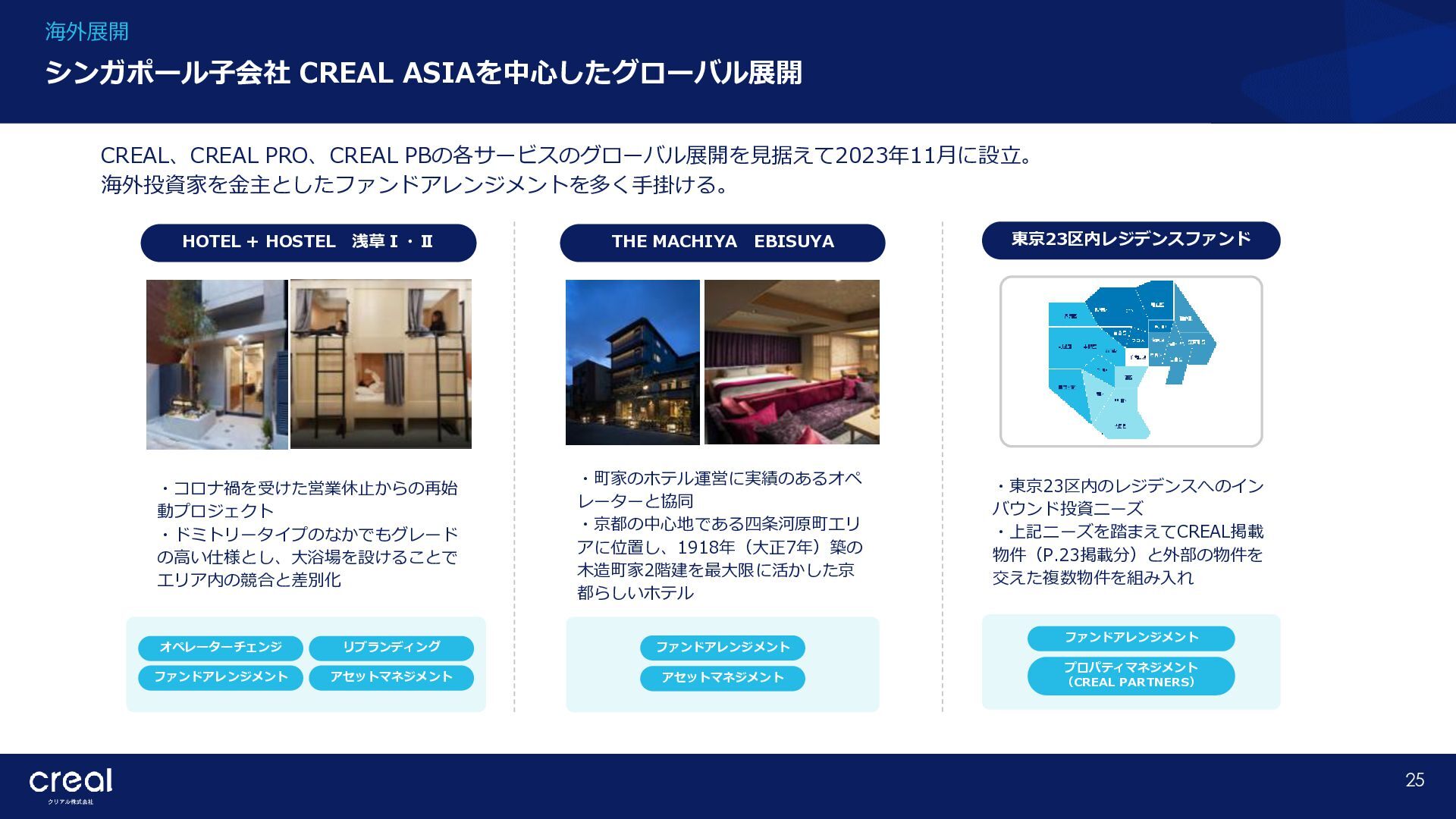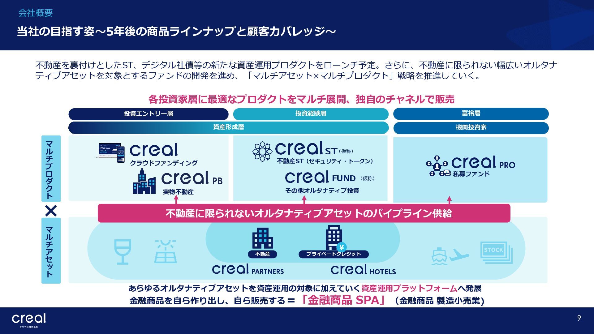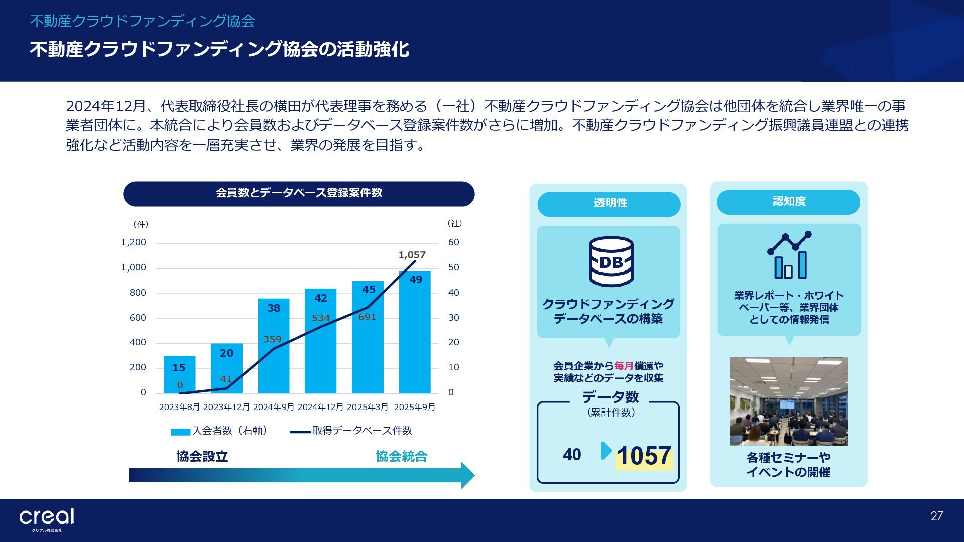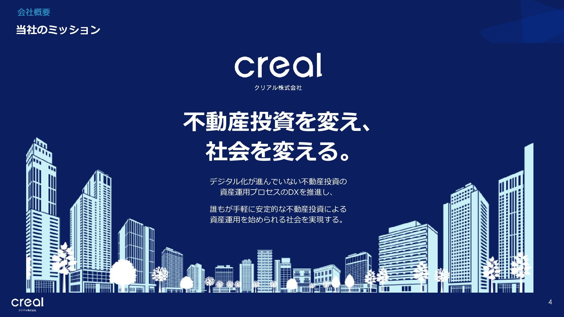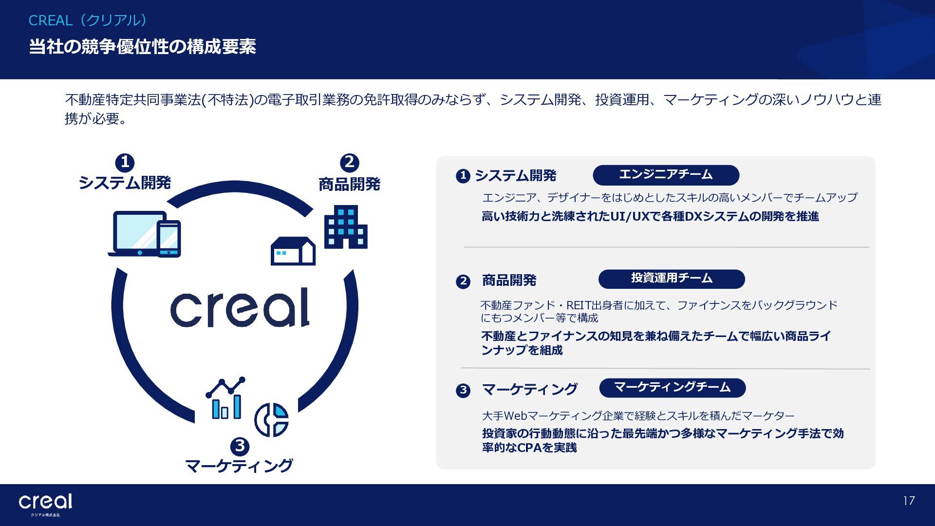 Market Report (Forecast to 2032) ※1 2022年から2032年までの⽇本のオンライン不動産投資残高の年率成長予測 ※2 2022年から2032年までのグローバルのオンライン不動産投資残高の年率成長予測 CAGR※1 50.6% (百万ドル) (百万ドル) 814 1,077 58,380 CAGR※2 50.9% 793,477 14,295 10,783 日本 グローバル 個人 投資家 28.2% 機関 投資家 71.8% 個人 投資家 28.0% 機関 投資家 72.0% オンライン不動産投資の進展 不動産クラウドファンディング市場の成長 CREAL(クリアル) 21 クラウドファンディング技術を活用することにより多くの個人がインターネットで少額から不動産に投資が可能となり、世界的にオン ライン不動産投資マーケットの拡大が予想されている。2032年の⽇本の市場規模は約583億ドル(2023年3⽉31⽇中心相場133.48円 換算で7.79兆円)とも推計されている。