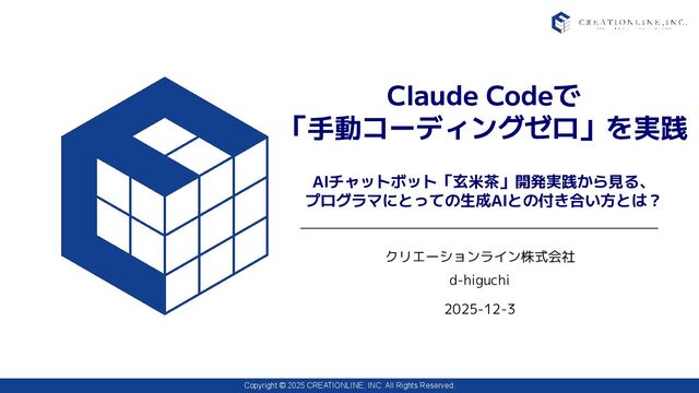 2025 CREATIONLINE, INC. All Rights Reserved. Claude Codeの課題 (1/2) ノウハウ共有の難しさ • どんどんチャットして履歴が流れてしまうので、 「こういうときはこういう指示をする」などのノウハウが共有しにくい • ~/.claude/projects/ 以下に貯まっているが JSONL で取り出 しにくい ◦ デフォルト30日間保存なので cleanupPeriodDays 設定で要延長 • 履歴も辿れるClaude Codeウェブフロントエンドがあるが決定打は? ◦ https://github.com/d-kimuson/claude-code-viewer ◦ https://github.com/sugyan/claude-code-webui ほか多数