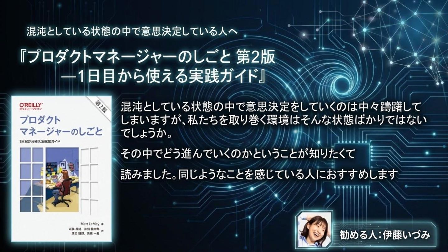 プロダクトマネージャーって何をすればいいのかよくわからない人へ 『プロダクトマネージャーのしごと 第2版 ―1日目から使える実践ガイド』 混沌としている状態の中で意思決定をしていくのは中々躊躇して しまいますが、私たちを取り巻く環境はそんな状態ばかりではない でしょうか。 その中でどう進んでいくのかということが知りたくて 読みました。同じようなことを感じている人におすすめします 勧める人:伊藤いづみ