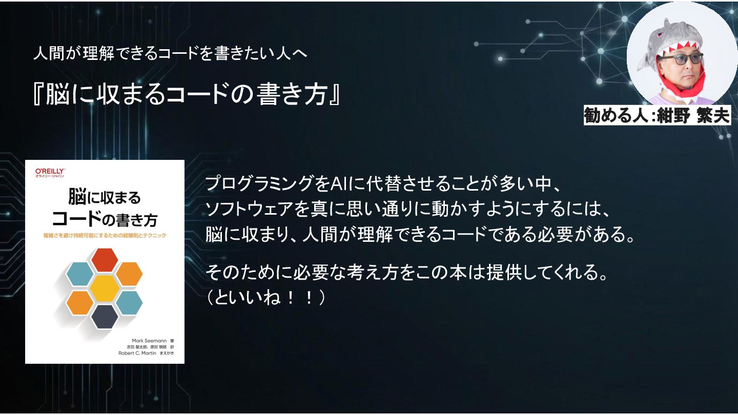 人間が理解できるコードを書きたい人へ 『脳に収まるコードの書き方』 プログラミングをAIに代替させることが多い中、 ソフトウェアを真に思い通りに動かすようにするには、 脳に収まり、人間が理解できるコードである必要がある。 そのために必要な考え方をこの本は提供してくれる。 (といいね!!) 勧める人:紺野 繁夫