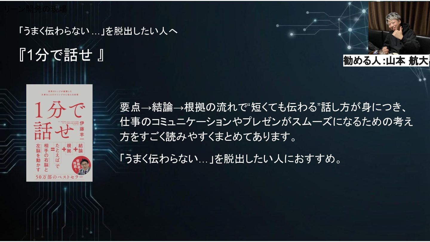 「うまく伝わらない…」を脱出したい人へ 『1分で話せ 』 要点→結論→根拠の流れで“短くても伝わる”話し方が身につき、 仕事のコミュニケーションやプレゼンがスムーズになるための考え 方をすごく読みやすくまとめてあります。 「うまく伝わらない…」を脱出したい人におすすめ。 リーン開発の現場 勧める人:山本 航大