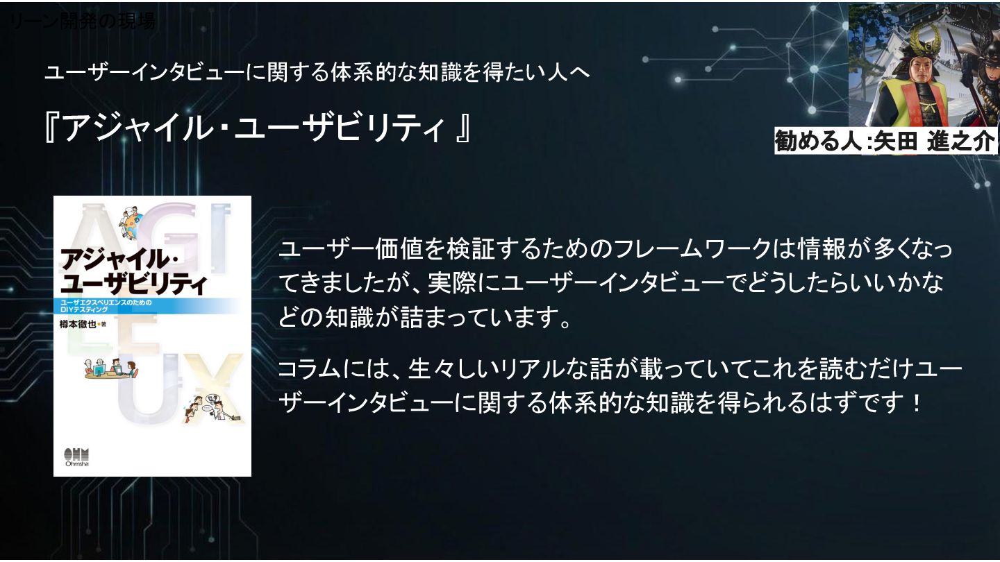 ユーザーインタビューに関する体系的な知識を得たい人へ 『アジャイル・ユーザビリティ 』 ユーザー価値を検証するためのフレームワークは情報が多くなっ てきましたが、実際にユーザーインタビューでどうしたらいいかな どの知識が詰まっています。 コラムには、生々しいリアルな話が載っていてこれを読むだけユー ザーインタビューに関する体系的な知識を得られるはずです! リーン開発の現場 勧める人:矢田