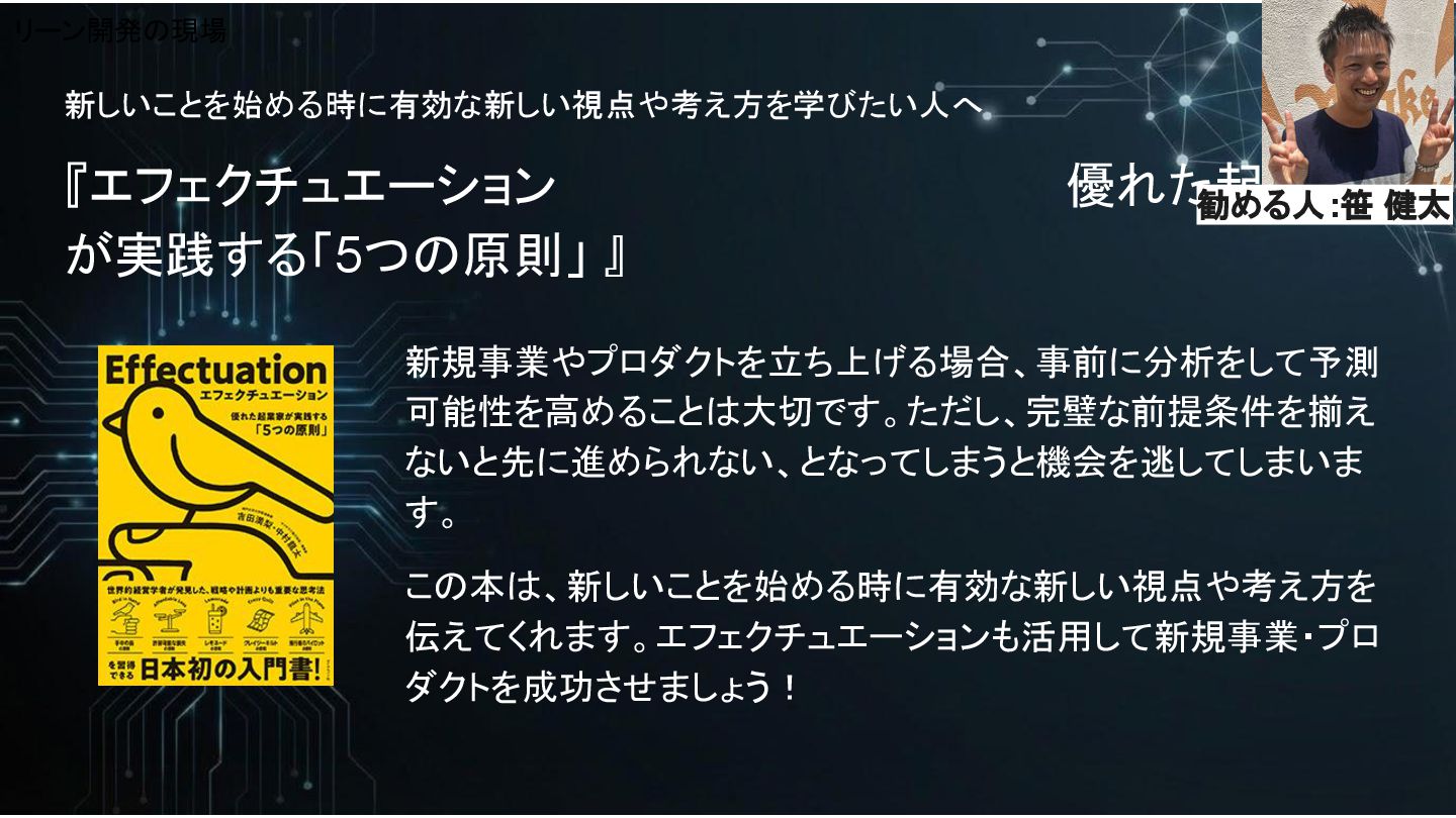 新しいことを始める時に有効な新しい視点や考え方を学びたい人へ 『エフェクチュエーション 優れた起業家 が実践する「5つの原則」 』 新規事業やプロダクトを立ち上げる場合、事前に分析をして予測 可能性を高めることは大切です。ただし、完璧な前提条件を揃え ないと先に進められない、となってしまうと機会を逃してしまいま す。 この本は、新しいことを始める時に有効な新しい視点や考え方を 伝えてくれます。エフェクチュエーションも活用して新規事業・プロ