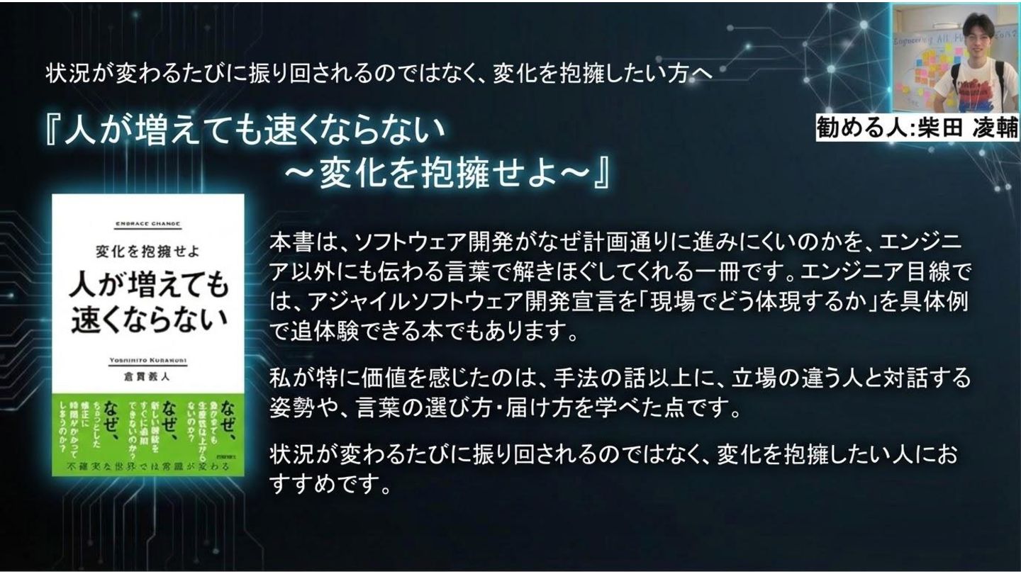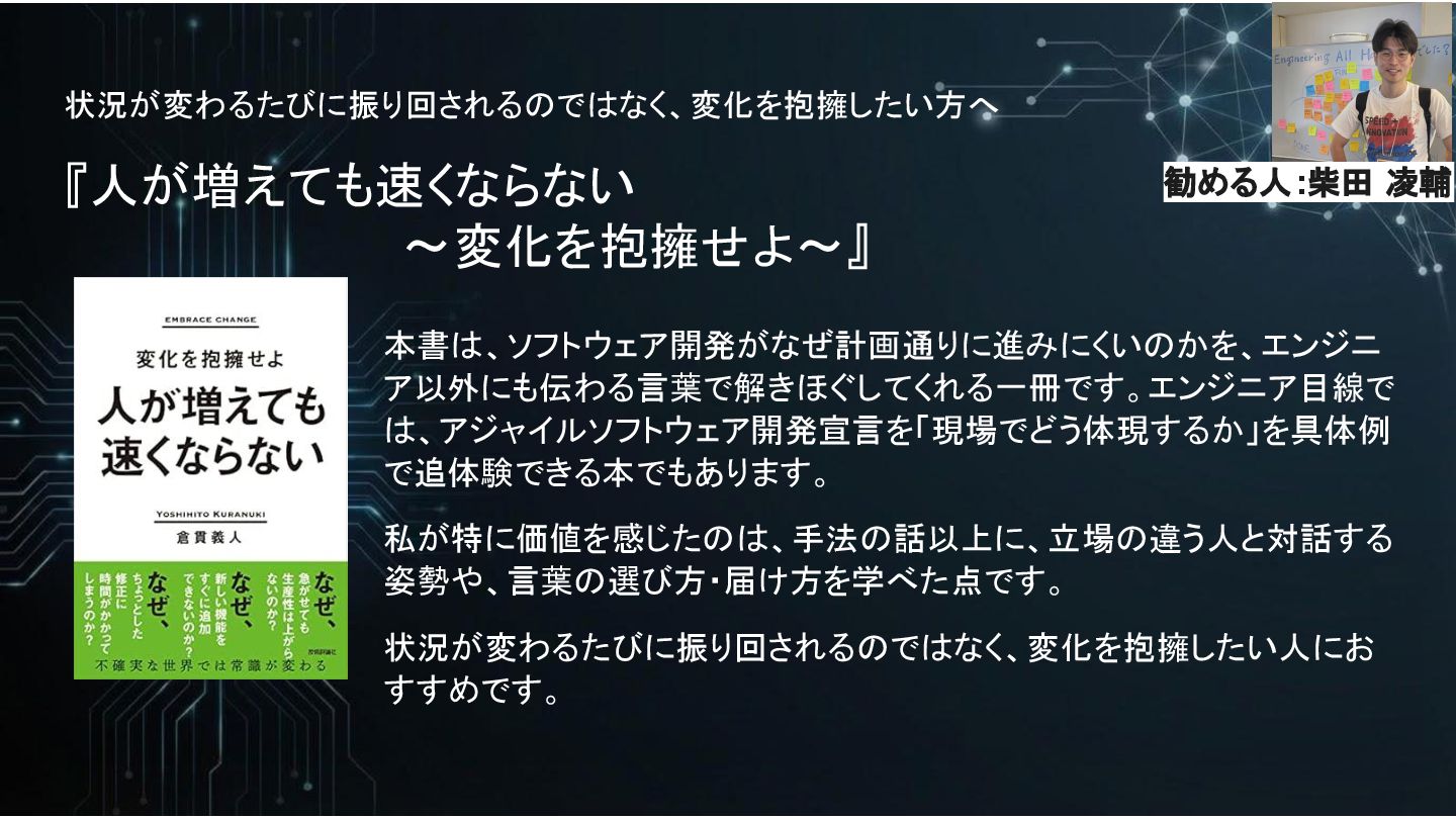 状況が変わるたびに振り回されるのではなく、変化を抱擁したい方へ 『人が増えても速くならない ~変化を抱擁せよ~』 本書は、ソフトウェア開発がなぜ計画通りに進みにくいのかを、エンジニ ア以外にも伝わる言葉で解きほぐしてくれる一冊です。エンジニア目線で は、アジャイルソフトウェア開発宣言を「現場でどう体現するか」を具体例 で追体験できる本でもあります。 私が特に価値を感じたのは、手法の話以上に、立場の違う人と対話する 姿勢や、言葉の選び方・届け方を学べた点です。 状況が変わるたびに振り回されるのではなく、変化を抱擁したい人にお