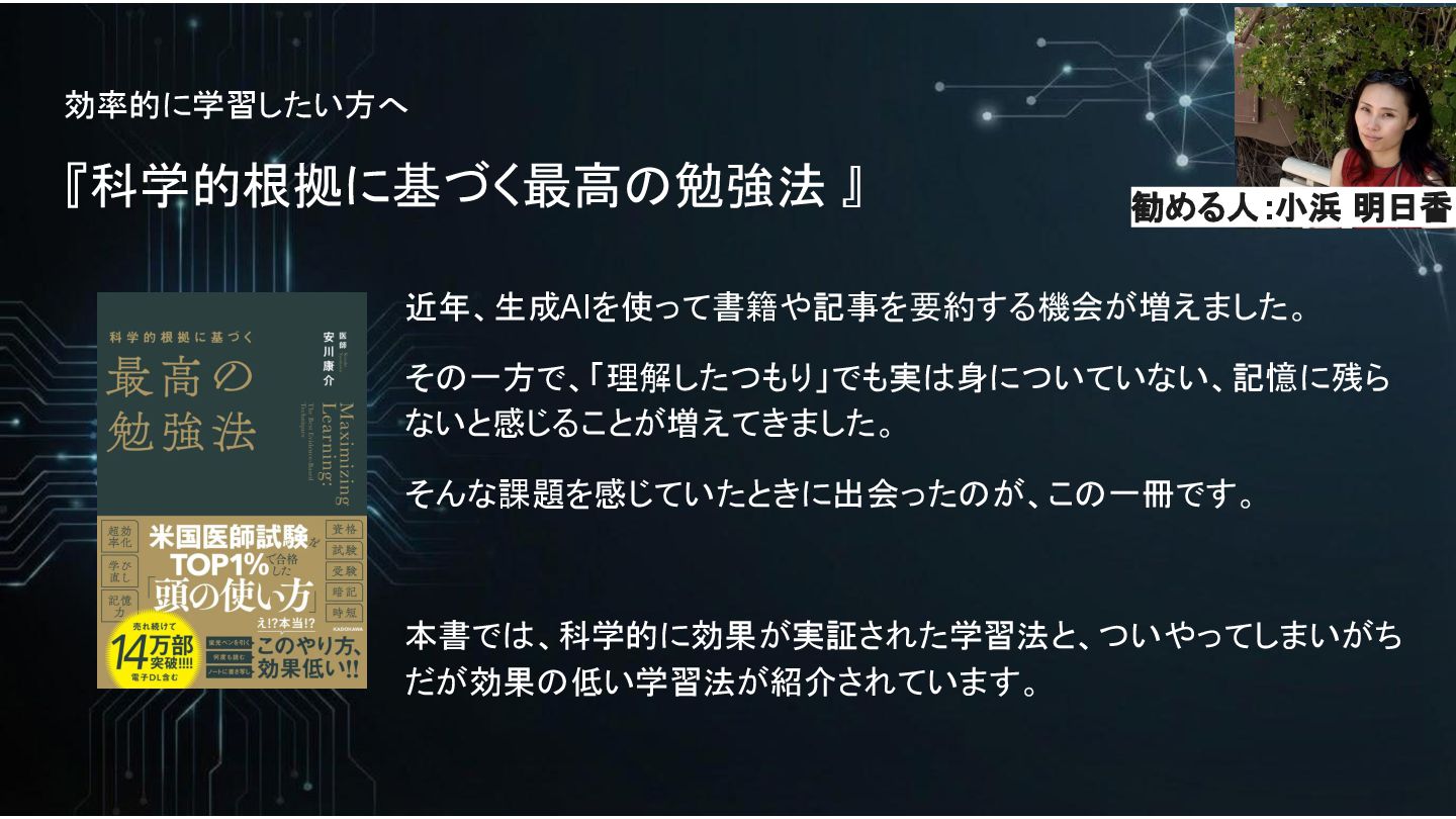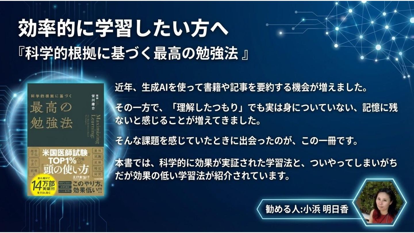 効率的に学習したい方へ 『科学的根拠に基づく最高の勉強法 』 近年、生成AIを使って書籍や記事を要約する機会が増えました。 その一方で、「理解したつもり」でも実は身についていない、記憶に残ら ないと感じることが増えてきました。 そんな課題を感じていたときに出会ったのが、この一冊です。 本書では、科学的に効果が実証された学習法と、ついやってしまいがち だが効果の低い学習法が紹介されています。 勧める人:小浜