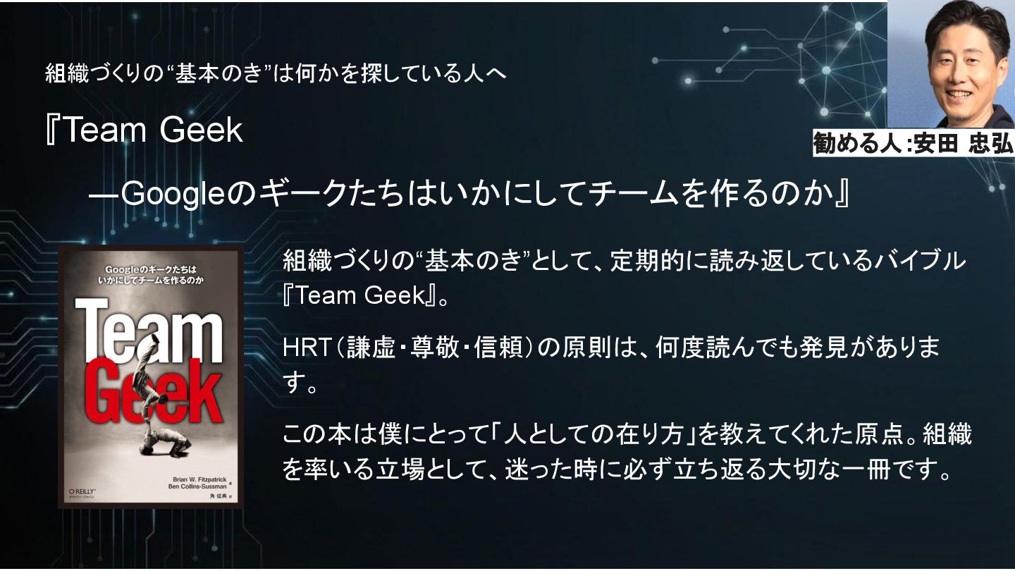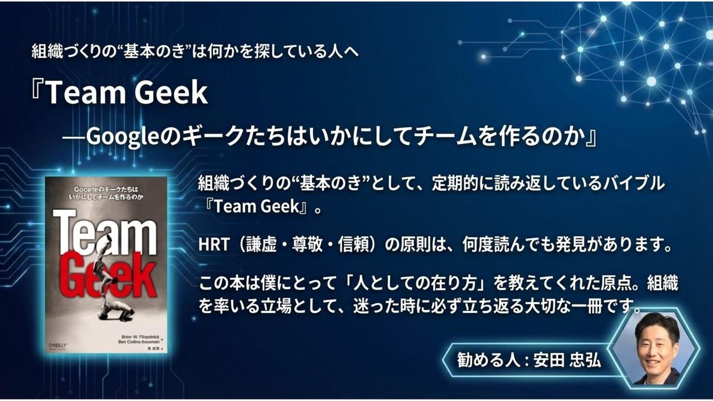 組織づくりの“基本のき”は何かを探している人へ 『Team Geek ―Googleのギークたちはいかにしてチームを作るのか』 組織づくりの“基本のき”として、定期的に読み返しているバイブル 『Team Geek』。 HRT(謙虚・尊敬・信頼)の原則は、何度読んでも発見がありま す。 この本は僕にとって「人としての在り方」を教えてくれた原点。組織