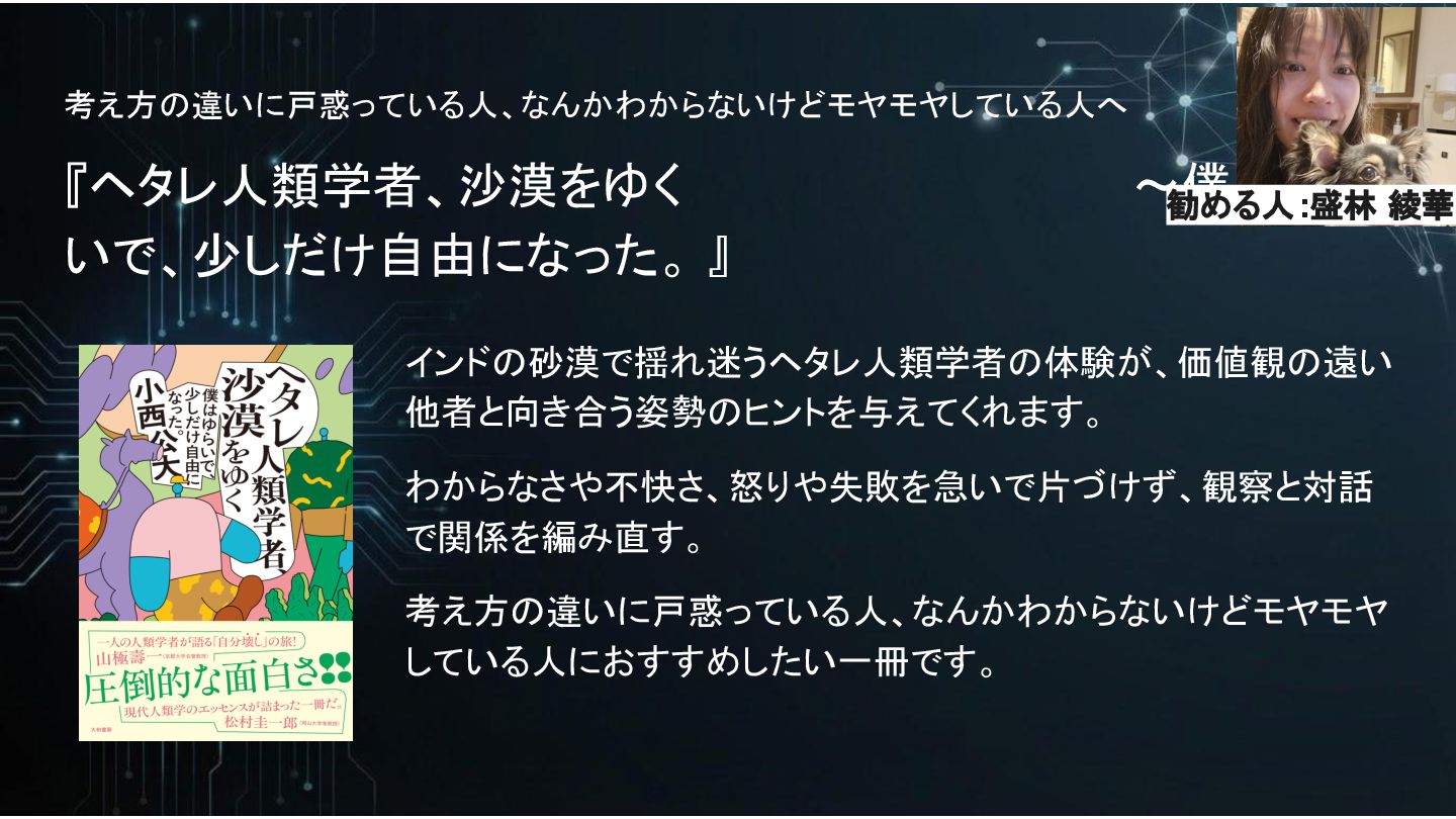 考え方の違いに戸惑っている人、なんかわからないけどモヤモヤしている人へ 『ヘタレ人類学者、沙漠をゆく ~僕はゆら いで、少しだけ自由になった。 』 インドの砂漠で揺れ迷うヘタレ人類学者の体験が、価値観の遠い 他者と向き合う姿勢のヒントを与えてくれます。 わからなさや不快さ、怒りや失敗を急いで片づけず、観察と対話 で関係を編み直す。