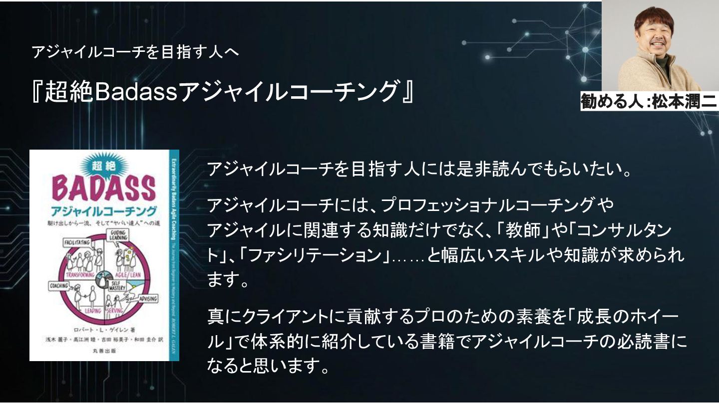 アジャイルコーチを目指す人へ 『超絶Badassアジャイルコーチング』 アジャイルコーチを目指す人には是非読んでもらいたい。 アジャイルコーチには、プロフェッショナルコーチングや アジャイルに関連する知識だけでなく、「教師」や「コンサルタン ト」、「ファシリテーション」……と幅広いスキルや知識が求められ ます。 真にクライアントに貢献するプロのための素養を「成長のホイー ル」で体系的に紹介している書籍でアジャイルコーチの必読書に なると思います。