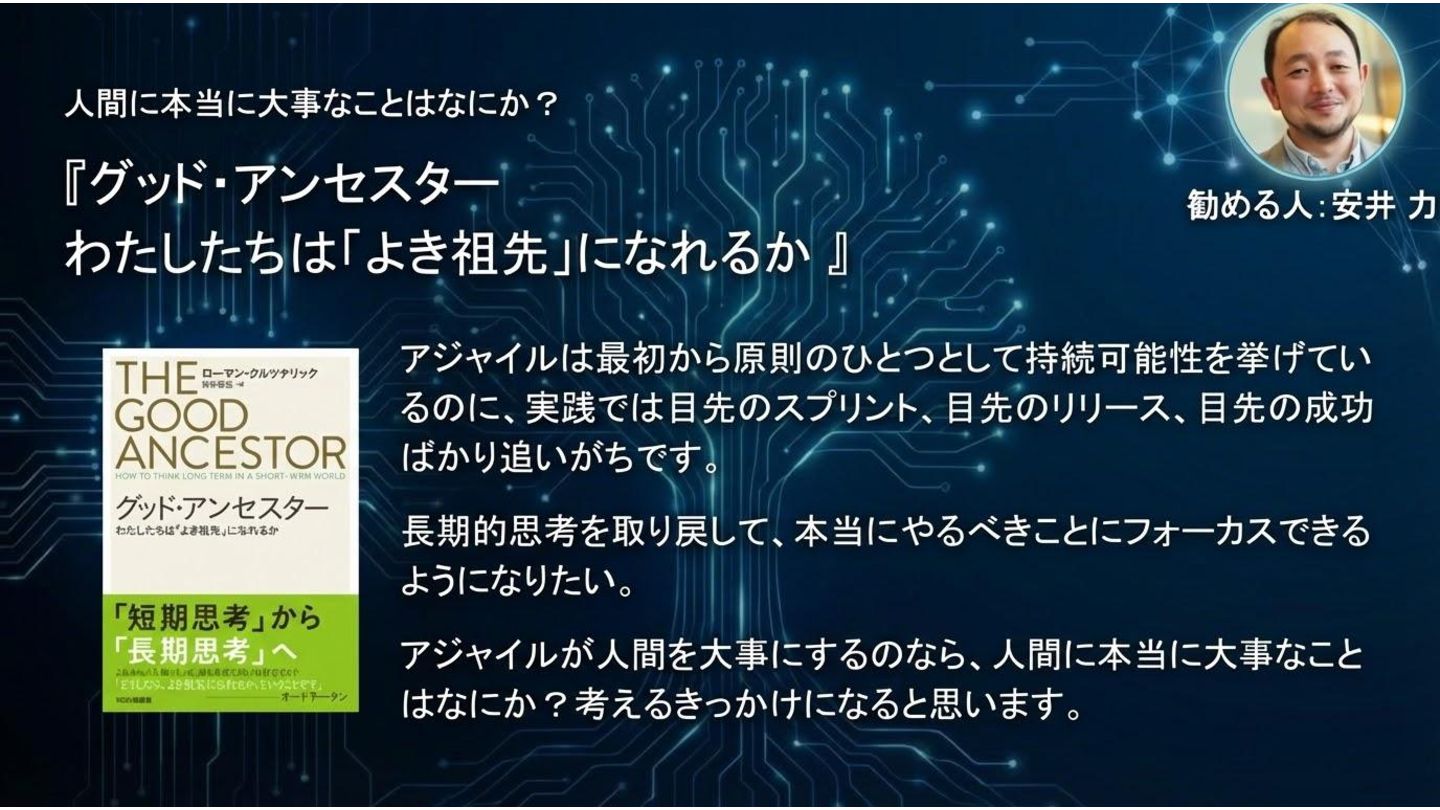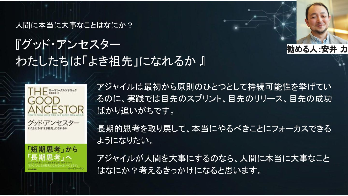 人間に本当に大事なことはなにか? 『グッド・アンセスター わたしたちは「よき祖先」になれるか 』 アジャイルは最初から原則のひとつとして持続可能性を挙げてい るのに、実践では目先のスプリント、目先のリリース、目先の成功 ばかり追いがちです。 長期的思考を取り戻して、本当にやるべきことにフォーカスできる ようになりたい。 アジャイルが人間を大事にするのなら、人間に本当に大事なこと