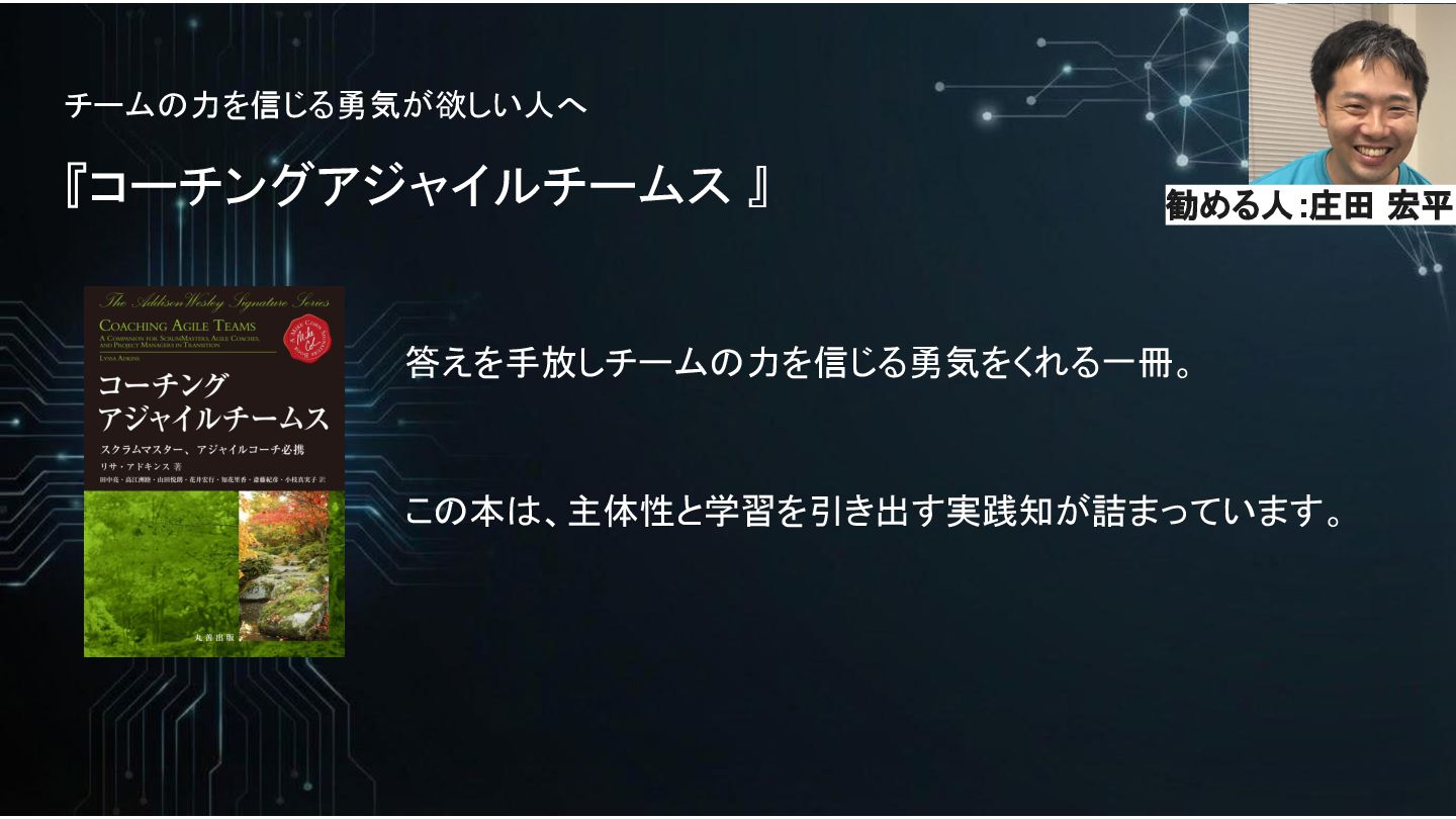 チームの力を信じる勇気が欲しい人へ 『コーチングアジャイルチームス 』 答えを手放しチームの力を信じる勇気をくれる一冊。 この本は、主体性と学習を引き出す実践知が詰まっています。 勧める人:庄田 宏平