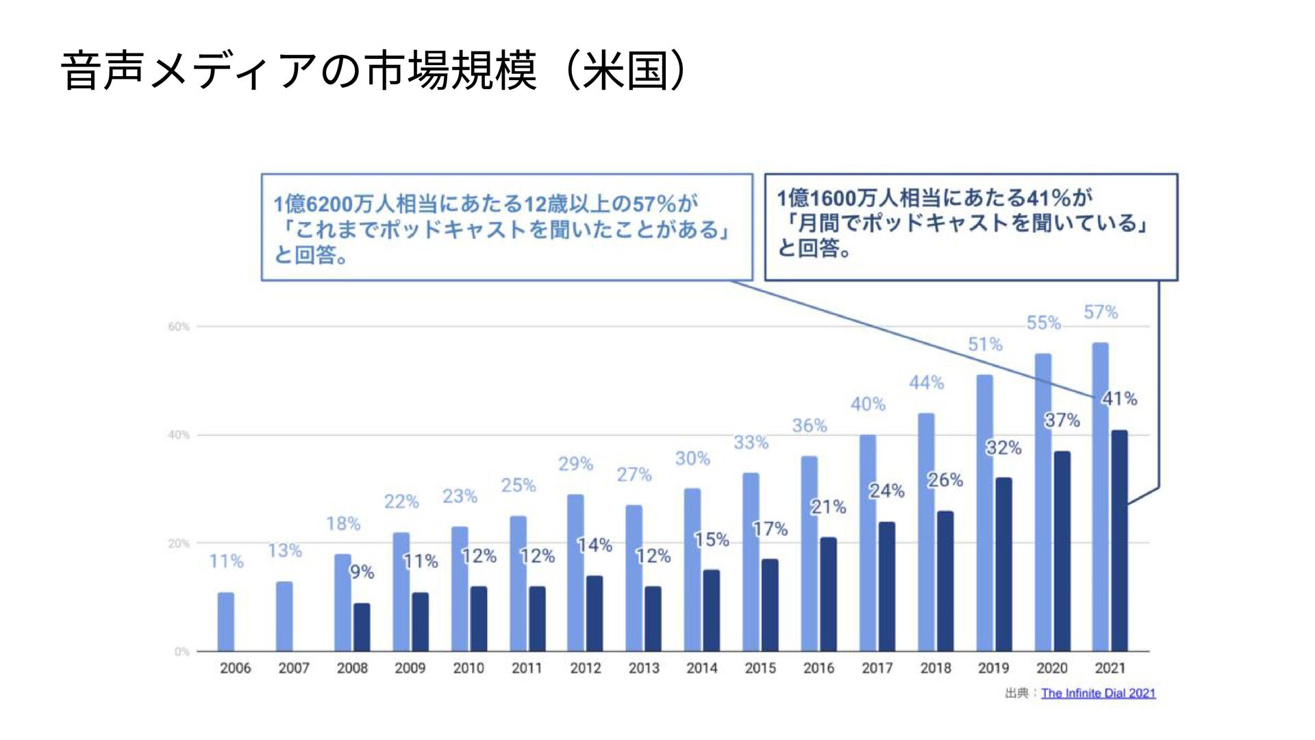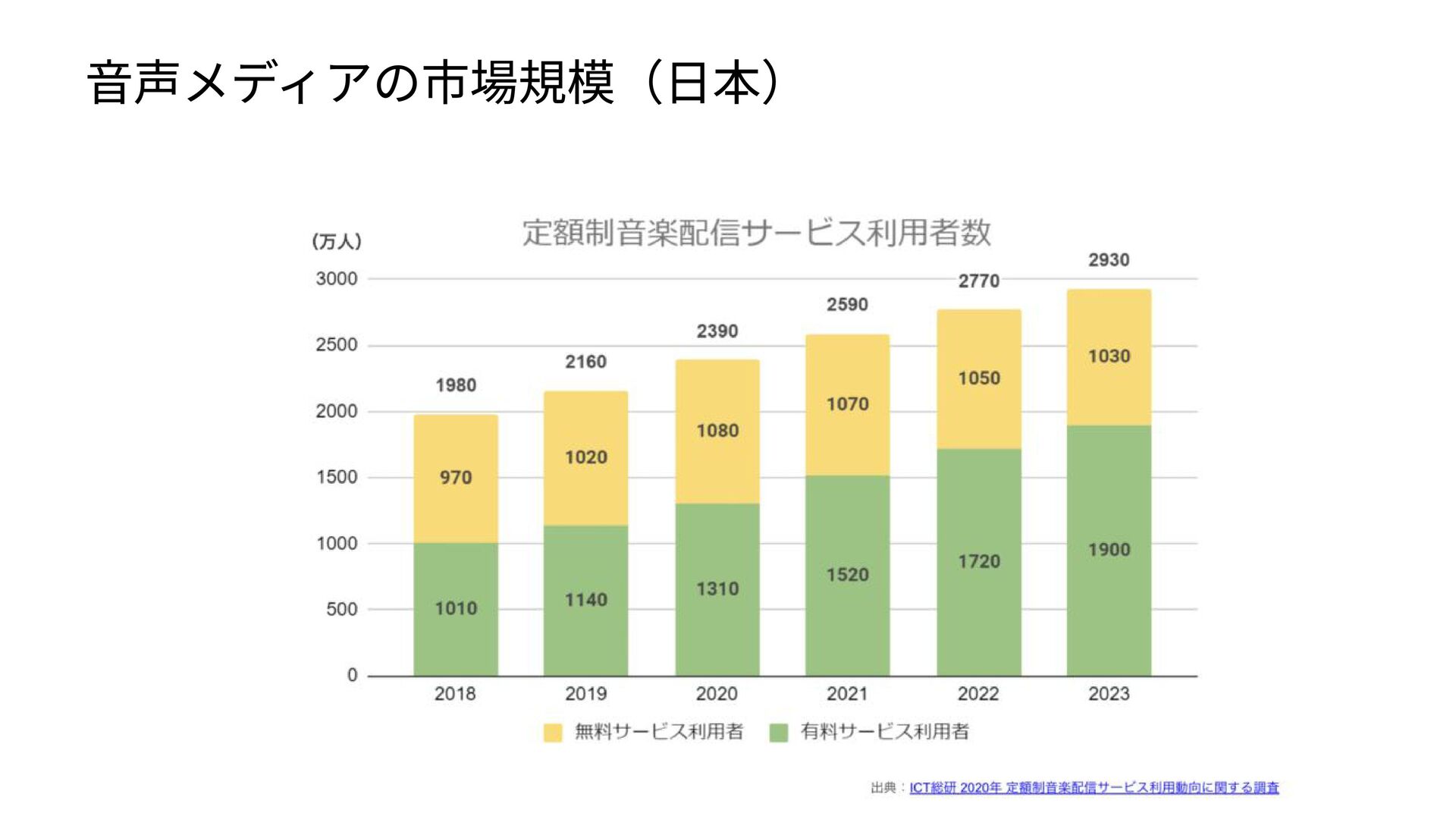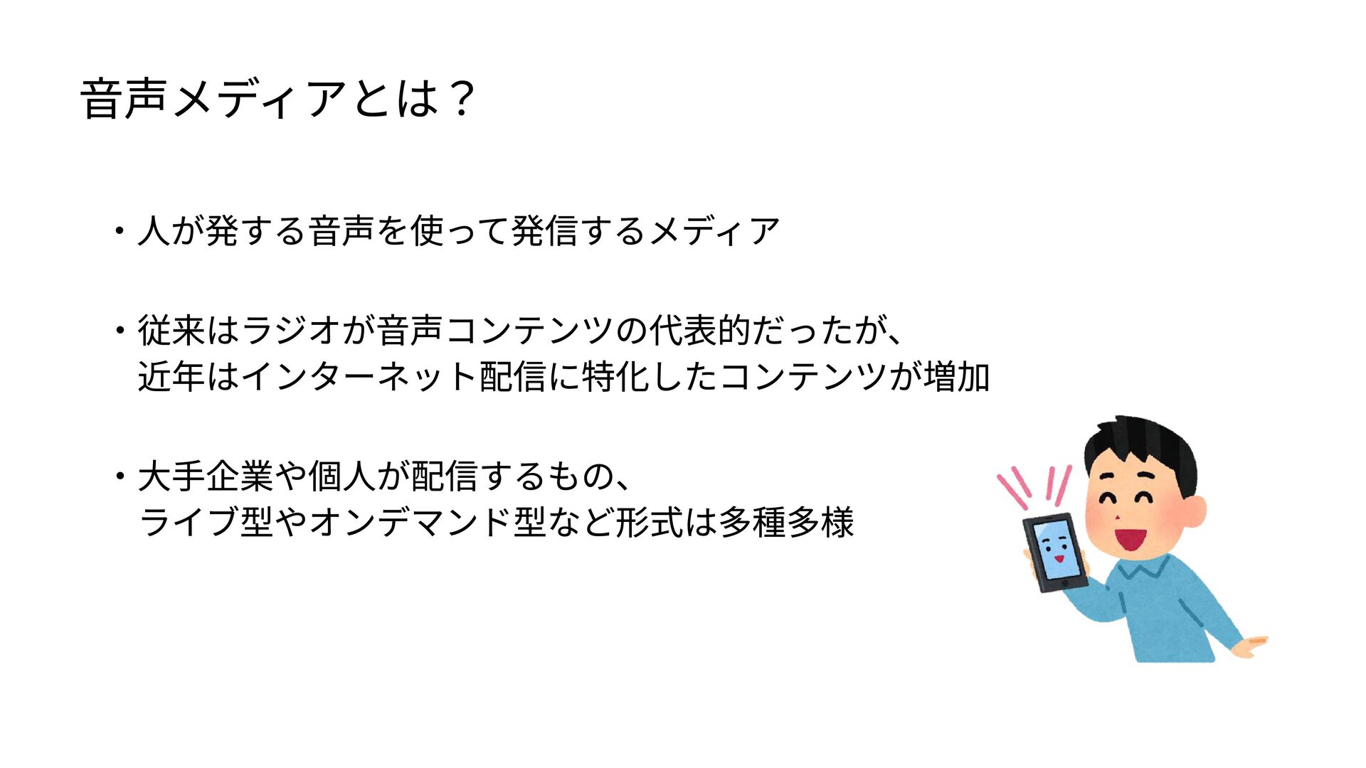 ・人が発する音声を使って発信するメディア ・従来はラジオが音声コンテンツの代表的だったが、 近年はインターネット配信に特化したコンテンツが増加 ・大手企業や個人が配信するもの、 ライブ型やオンデマンド型など形式は多種多様 音声メディアとは?
