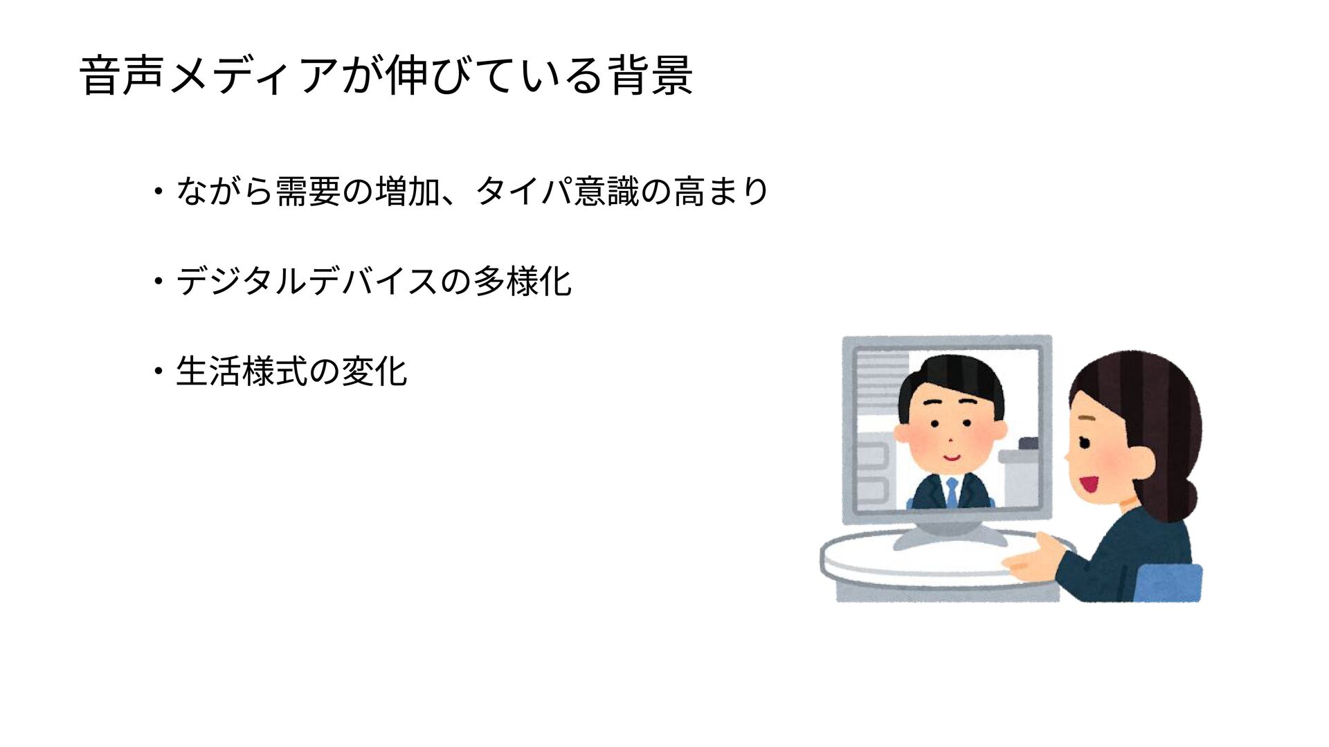 音声メディアが伸びている背景 ・ながら需要の増加、タイパ意識の高まり ・デジタルデバイスの多様化 ・生活様式の変化