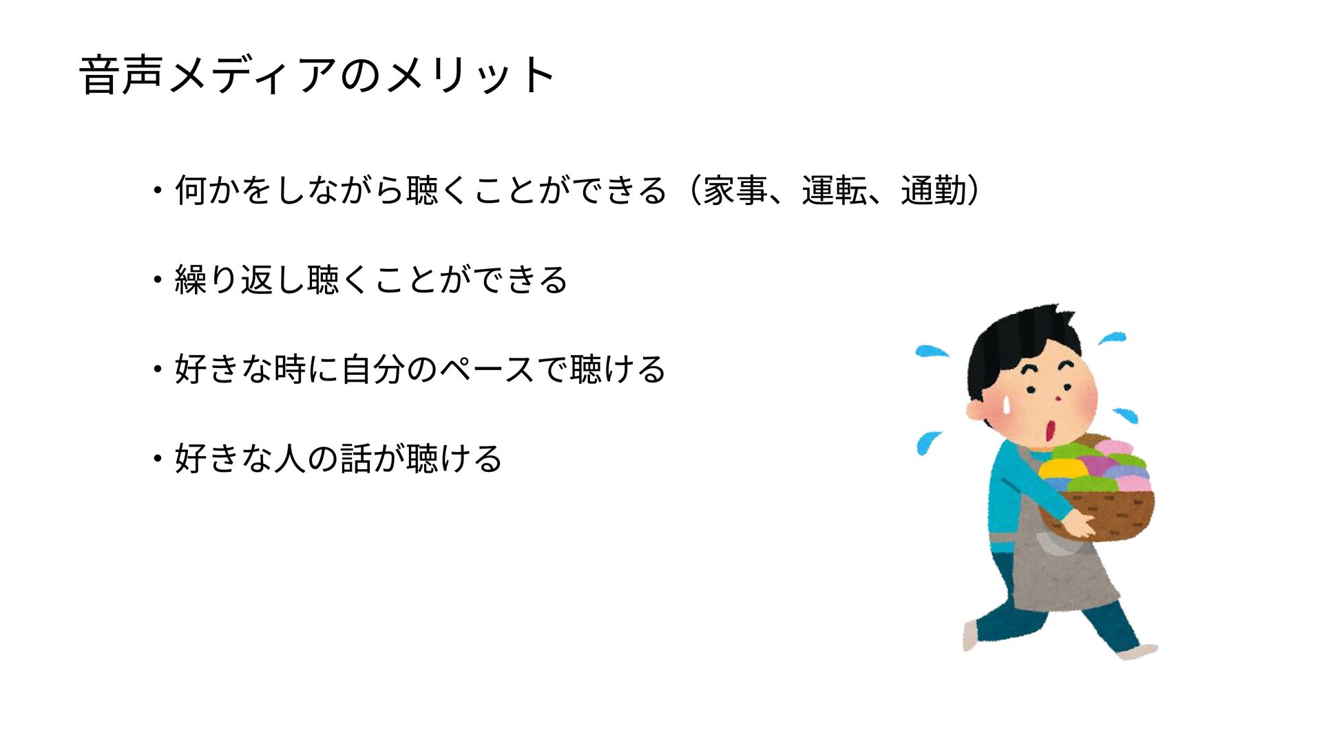 音声メディアのメリット ・何かをしながら聴くことができる(家事、運転、通勤) ・繰り返し聴くことができる ・好きな時に自分のペースで聴ける ・好きな人の話が聴ける