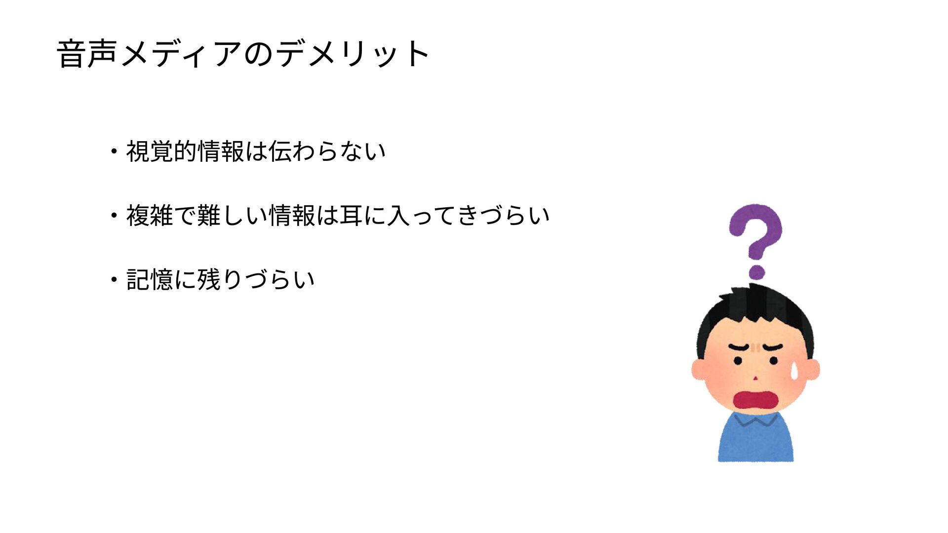 音声メディアのデメリット ・視覚的情報は伝わらない ・複雑で難しい情報は耳に入ってきづらい ・記憶に残りづらい