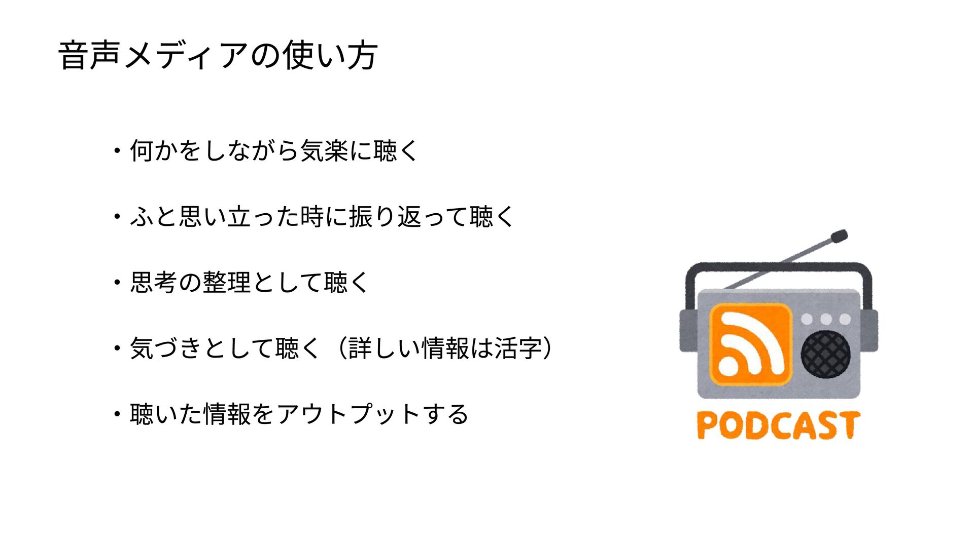 音声メディアの使い方 ・何かをしながら気楽に聴く ・ふと思い立った時に振り返って聴く ・思考の整理として聴く ・気づきとして聴く(詳しい情報は活字) ・聴いた情報をアウトプットする