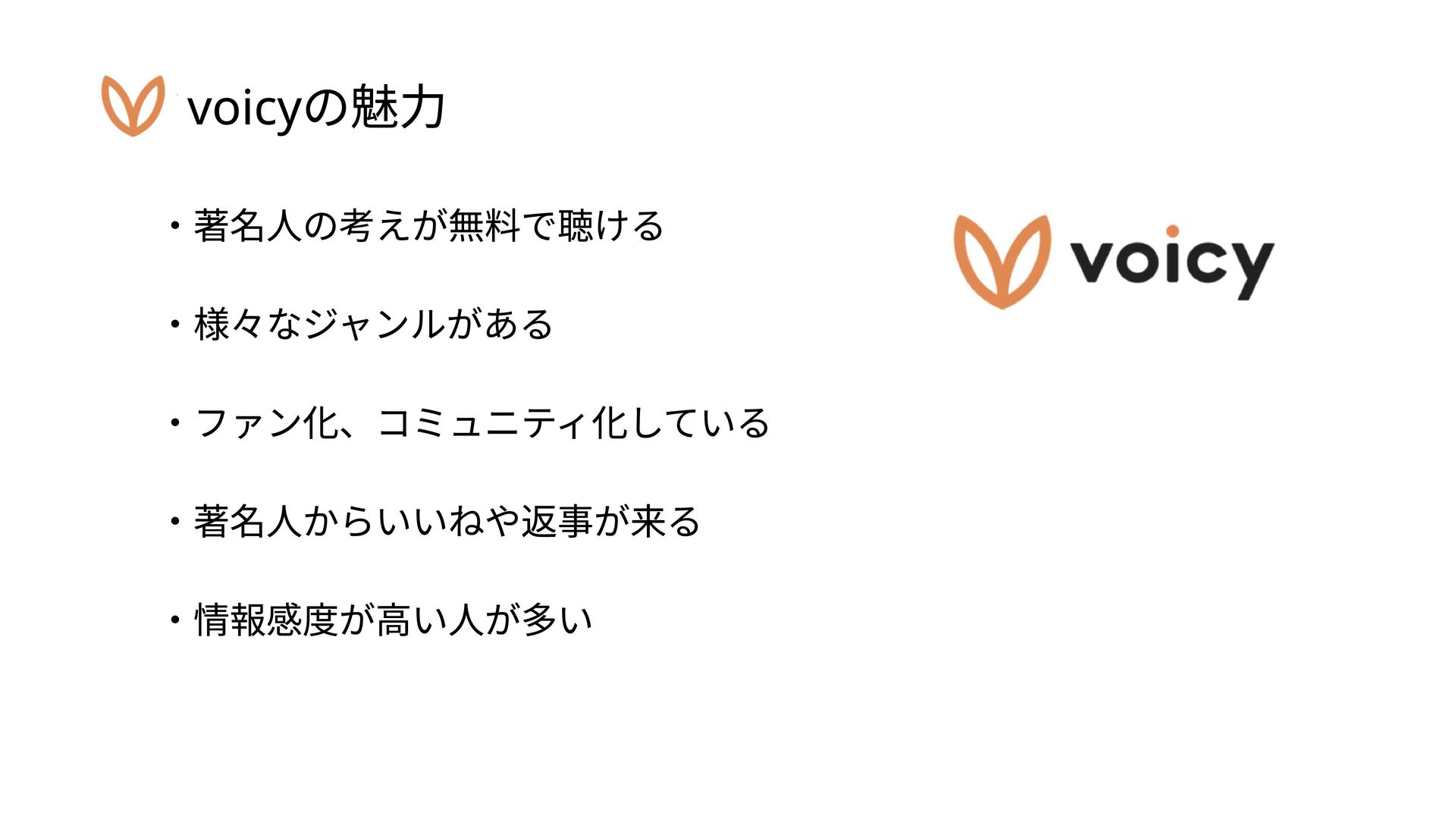 ・著名人の考えが無料で聴ける ・様々なジャンルがある ・ファン化、コミュニティ化している ・著名人からいいねや返事が来る ・情報感度が高い人が多い voicyの魅力