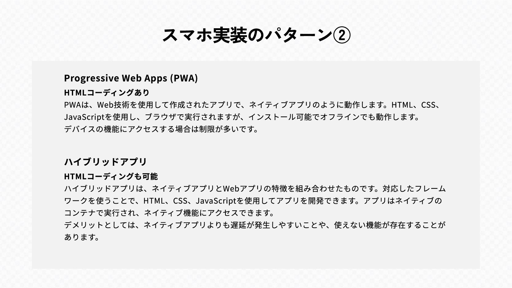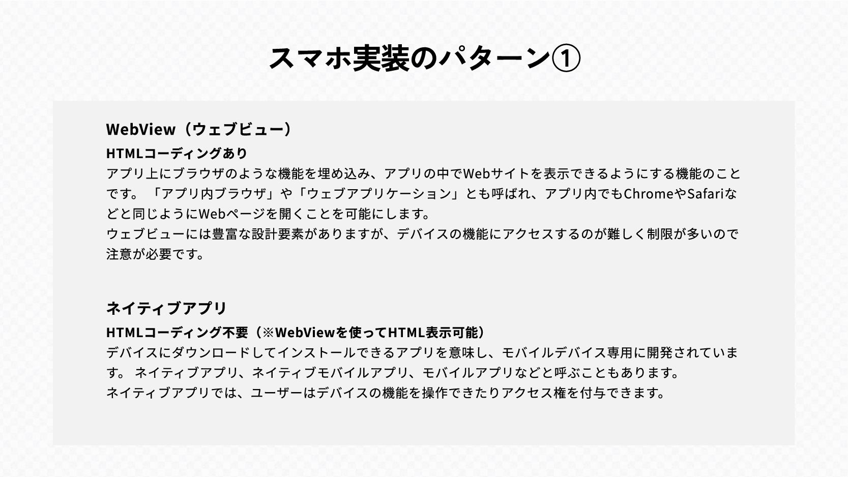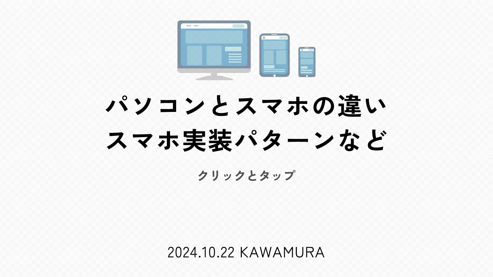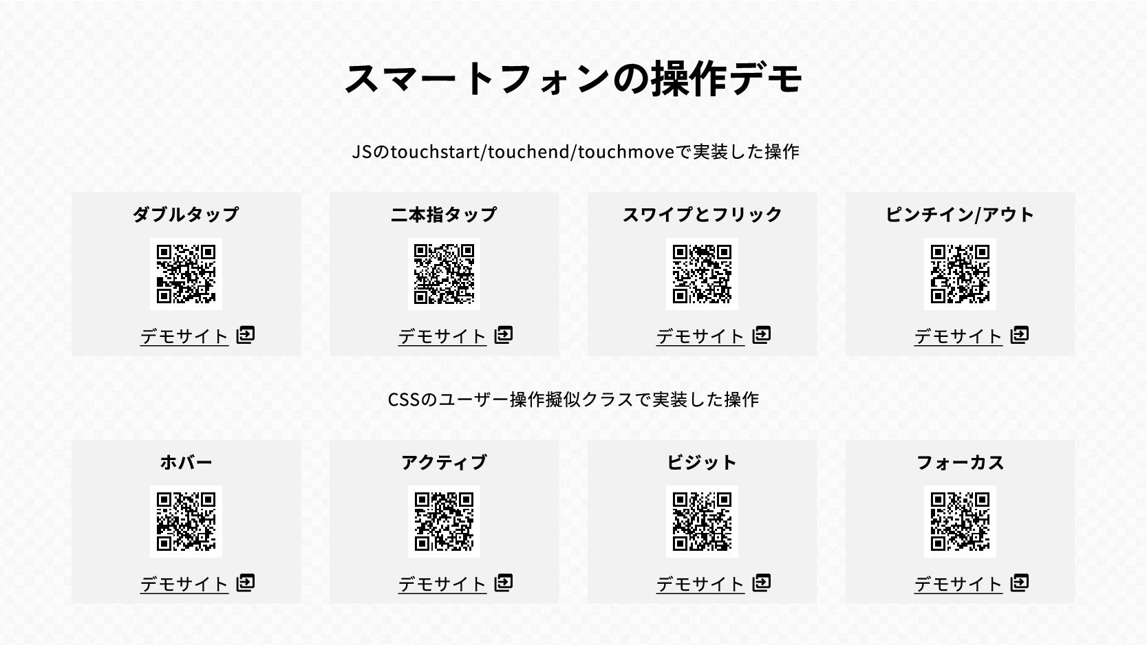 ドラッグ&ドロップ 要素の移動に使用 スクロール ページを上下に移動 ホバー 要素にカーソルがある状態 アクティブ クリックされている状態 ビジット アクティブがなされた要素 フォーカス クリックやタブ移動などで要 素が選択されている状態 スマートフォン タップ(一本指) クリックに相当 ダブルタップ(一本指) ズームやスタンプなど特定の アクションを実行 二本指タップ 指を2本どうじにタップする ロ ング タップ (タッチアンドホールド) 右 クリックに相当 スワイ プ 指を画面 上で滑らせ る フリック スワイ プの短 いバ ージョン ピンチイン/ピンチアウト 2本指で摘む/拡げ る動作 ドラ ッグ 指で押 し続け 要素を移動 スクロ ール 指を上下に動か す アクティブ タッチ された瞬間 ビジット アクティブがなされた要素 フォーカス タッチ して選択された状態