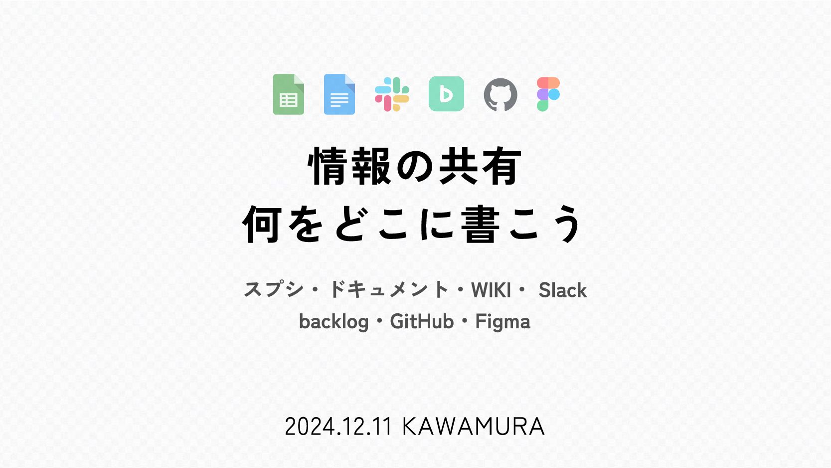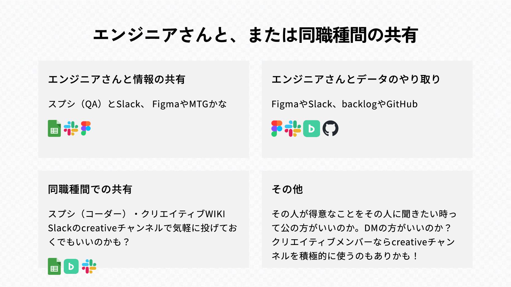 データや成果物(設計書、レポート)・問題点やリスクの報告と解決策の検討 スケジュールやマイルストーン・関連部署や外部関係者との連携内容 同じ職種 専門スキルやノウハウの共有・業界動向や新技術の情報 ベストプラクティスや事例研究・業務上の課題や困難の解決策 業務効率を上げるツールや手法の提案・資格取得や研修情報の共有 個人間 業務に関する直接的な依頼や報告・個別のフィードバックや相談 スケジュール調整やタスク進行状況・個別プロジェクトにおけるデータ共有 指導や教育(新人や後輩へのアドバイス)・直接関係者間の課題解決