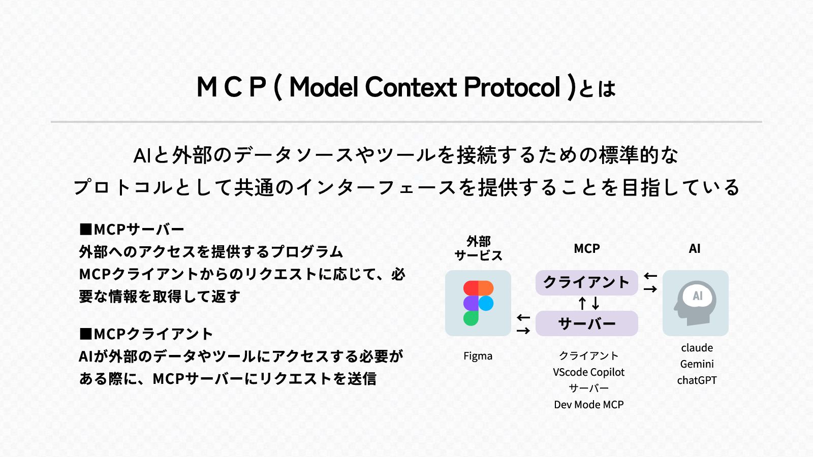 ▪MCPサーバー 外部へのアクセスを提供するプログラム MCPクライアントからのリクエストに応じて、必 要な情報を取得して返す ▪MCPクライアント AIが外部のデータやツールにアクセスする必要が ある際に、MCPサーバーにリクエストを送信 クライアント サーバー ↑↓ ← → ← → Figma クライアント VScode Copilot サーバー Dev Mode MCP claude Gemini chatGPT 外部 サービス MCP AI