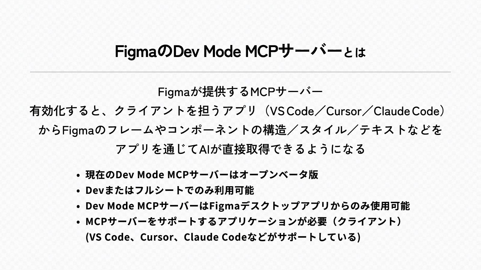 FigmaのDev Mode MCPサーバーとは Figmaが提供するMCPサーバー 有効化すると、クライアントを担うアプリ(VS Code/Cursor/Claude Code) からFigmaのフレームやコンポーネントの構造/スタイル/テキストなどを アプリを通じてAIが直接取得できるようになる µ 現在のDev Mode