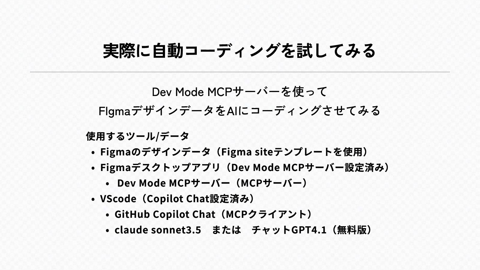 実際に自動コーディングを試してみる Dev Mode MCPサーバーを使って FIgmaデザインデータをAIにコーディングさせてみる 使用するツール/デーq Figmaのデザインデータ(Figma siteテンプレートを使用s