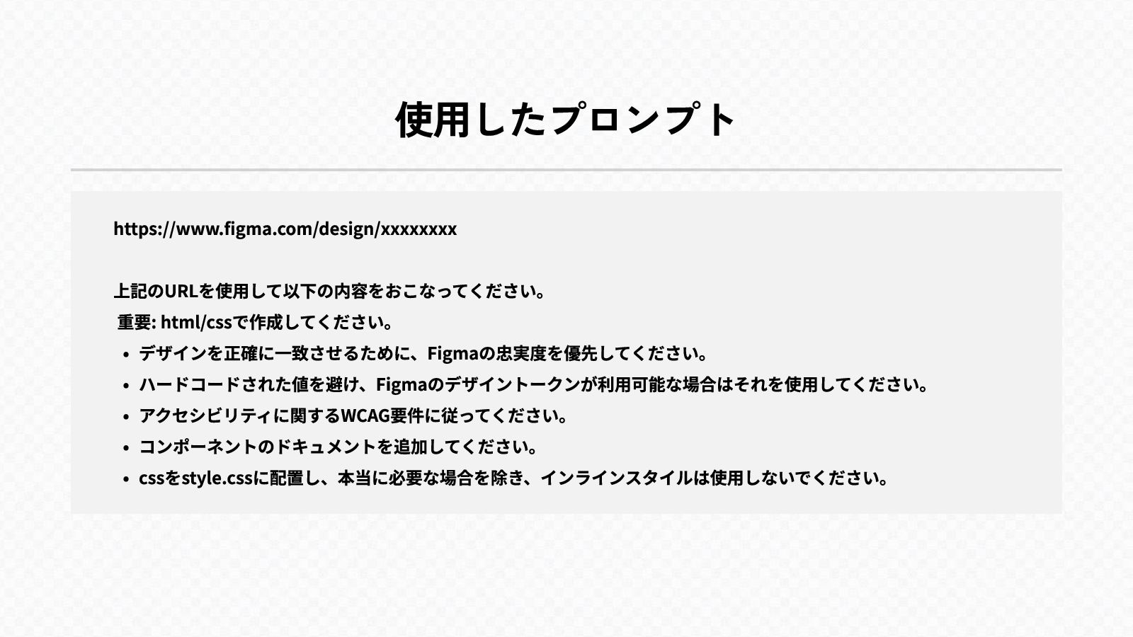 使用したプロンプト https://www.figma.com/design/xxxxxxxx 上記のURLを使用して以下の内容をおこなってください。 重要: html/cssで作成してくださいs R デザインを正確に一致させるために、Figmaの忠実度を優先してくださいs R ハードコードされた値を避け、Figmaのデザイントークンが利用可能な場合はそれを使用してくださいs R