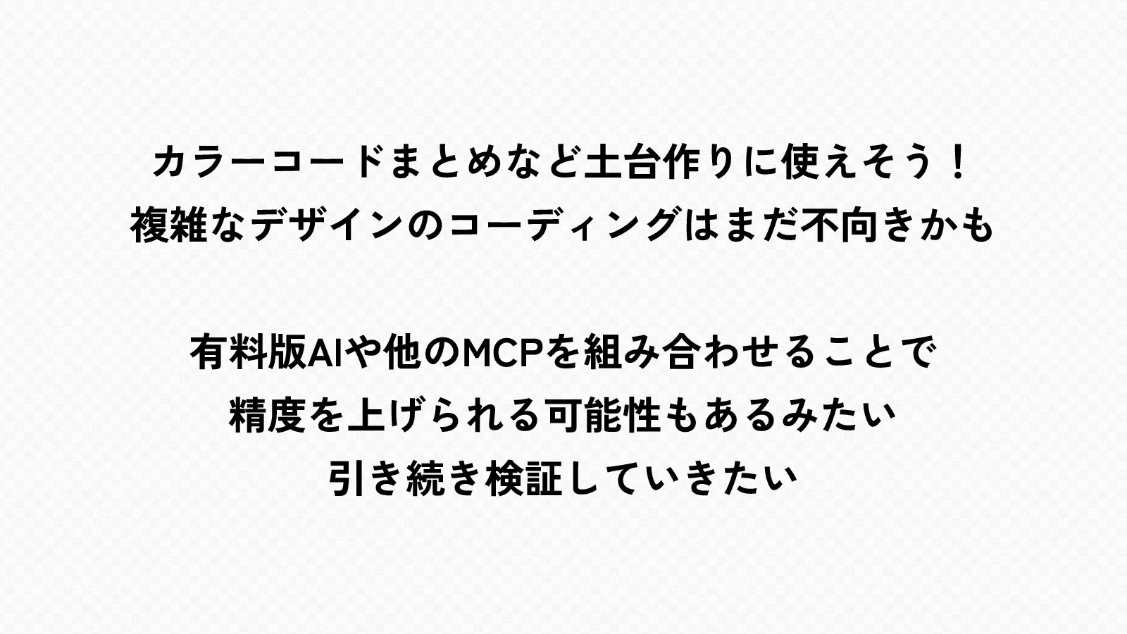 カラーコードまとめなど土台作りに使えそう! 複雑なデザインのコーディングはまだ不向きかも 有料版AIや他のMCPを組み合わせることで 精度を上げられる可能性もあるみたい 引き続き検証していきたい