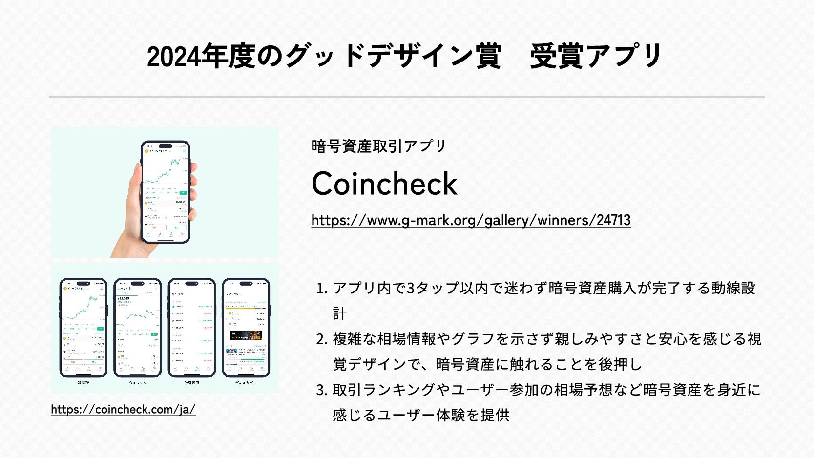 2024年度のグッドデザイン賞 受賞アプリ https://coincheck.com/ja/ 暗号資産取引アプリ Coincheck https://www.g-mark.org/gallery/winners/24713 アプリ内で3タップ以内で迷わず暗号資産購入が完了する動線設 o 複雑な相場情報やグラフを示さず親しみやすさと安心を感じる視