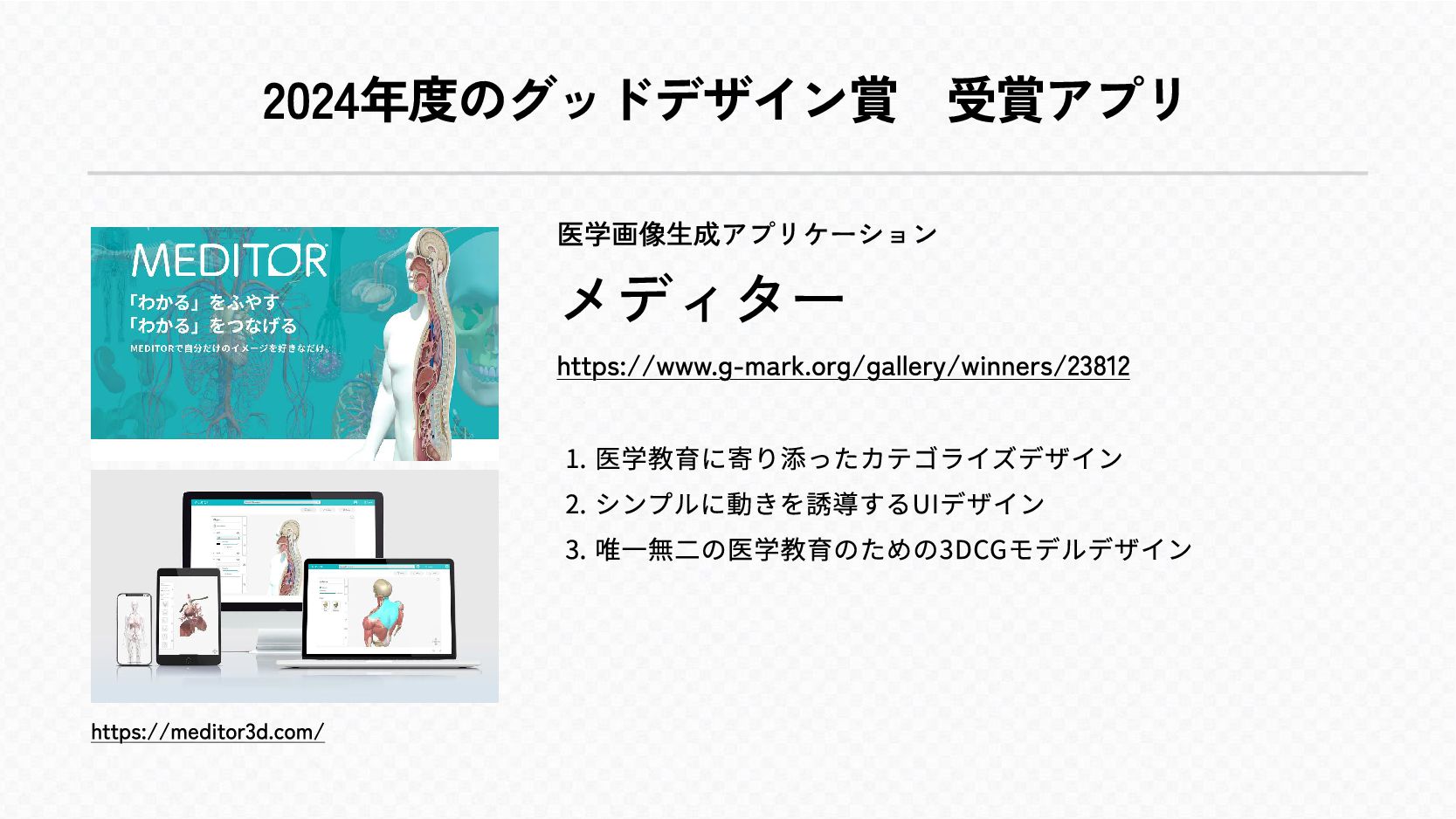 2024年度のグッドデザイン賞 受賞アプリ https://meditor3d.com/ 医学画像生成アプリケーション メディター https://www.g-mark.org/gallery/winners/23812 zo 医学教育に寄り添ったカテゴライズデザイh eo シンプルに動きを誘導するUIデザイh do
