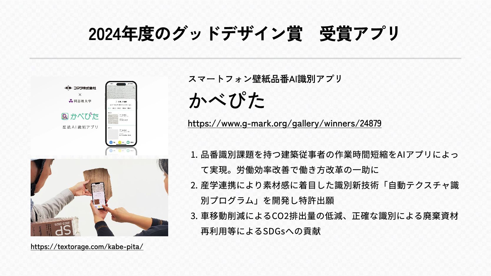 2024年度のグッドデザイン賞 受賞アプリ https://textorage.com/kabe-pita/ スマートフォン壁紙品番AI識別アプリ かべぴた https://www.g-mark.org/gallery/winners/24879 ÅÁ 品番識別課題を持つ建築従事者の作業時間短縮をAIアプリによっ て実現。労働効率改善で働き方改革の一助© Á 産学連携により素材感に着目した識別新技術「自動テクスチャ識