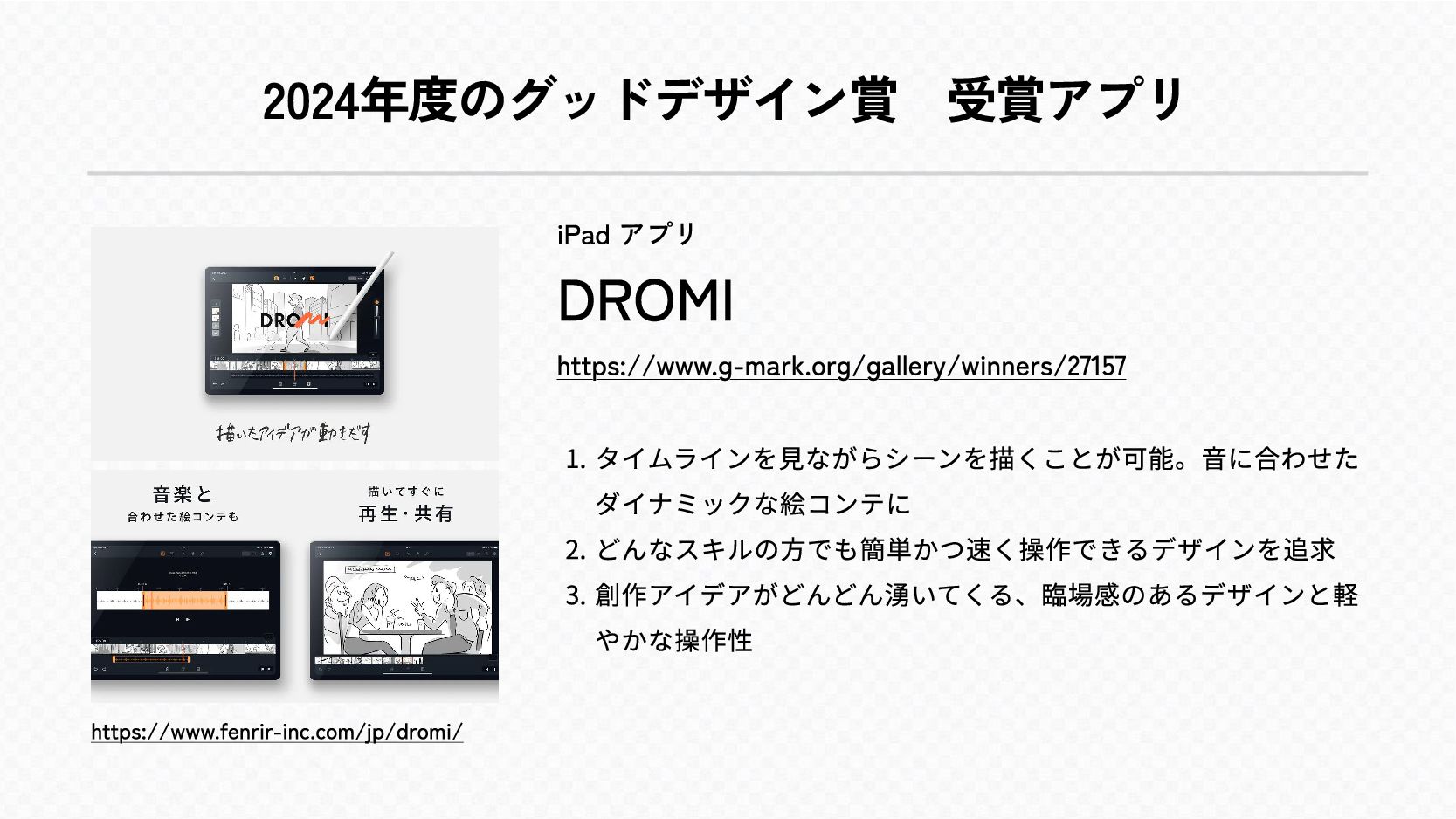2024年度のグッドデザイン賞 受賞アプリ https://www.fenrir-inc.com/jp/dromi/ iPad アプリ DROMI https://www.g-mark.org/gallery/winners/27157 { タイムラインを見ながらシーンを描くことが可能。音に合わせた ダイナミックな絵コンテ g