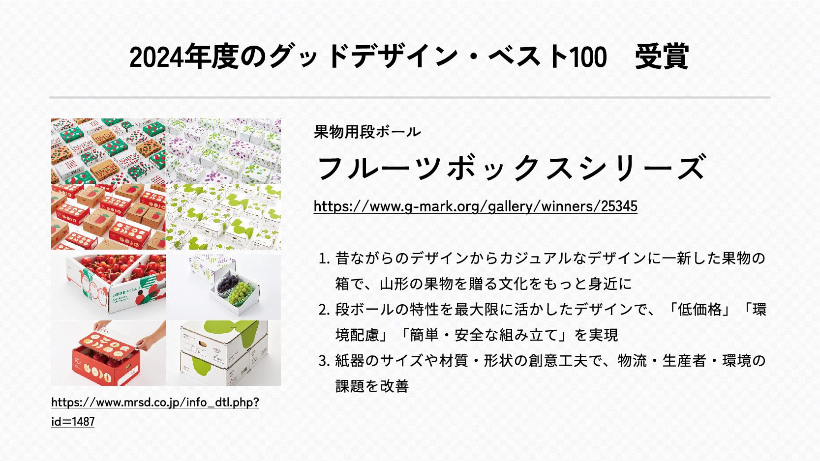 2024年度のグッドデザイン・ベスト100 受賞 https://www.mrsd.co.jp/info_dtl.php? id=1487 果物用段ボール フルーツボックスシリーズ https://www.g-mark.org/gallery/winners/25345 ¬ 昔ながらのデザインからカジュアルなデザインに一新した果物の 箱で、山形の果物を贈る文化をもっと身近±