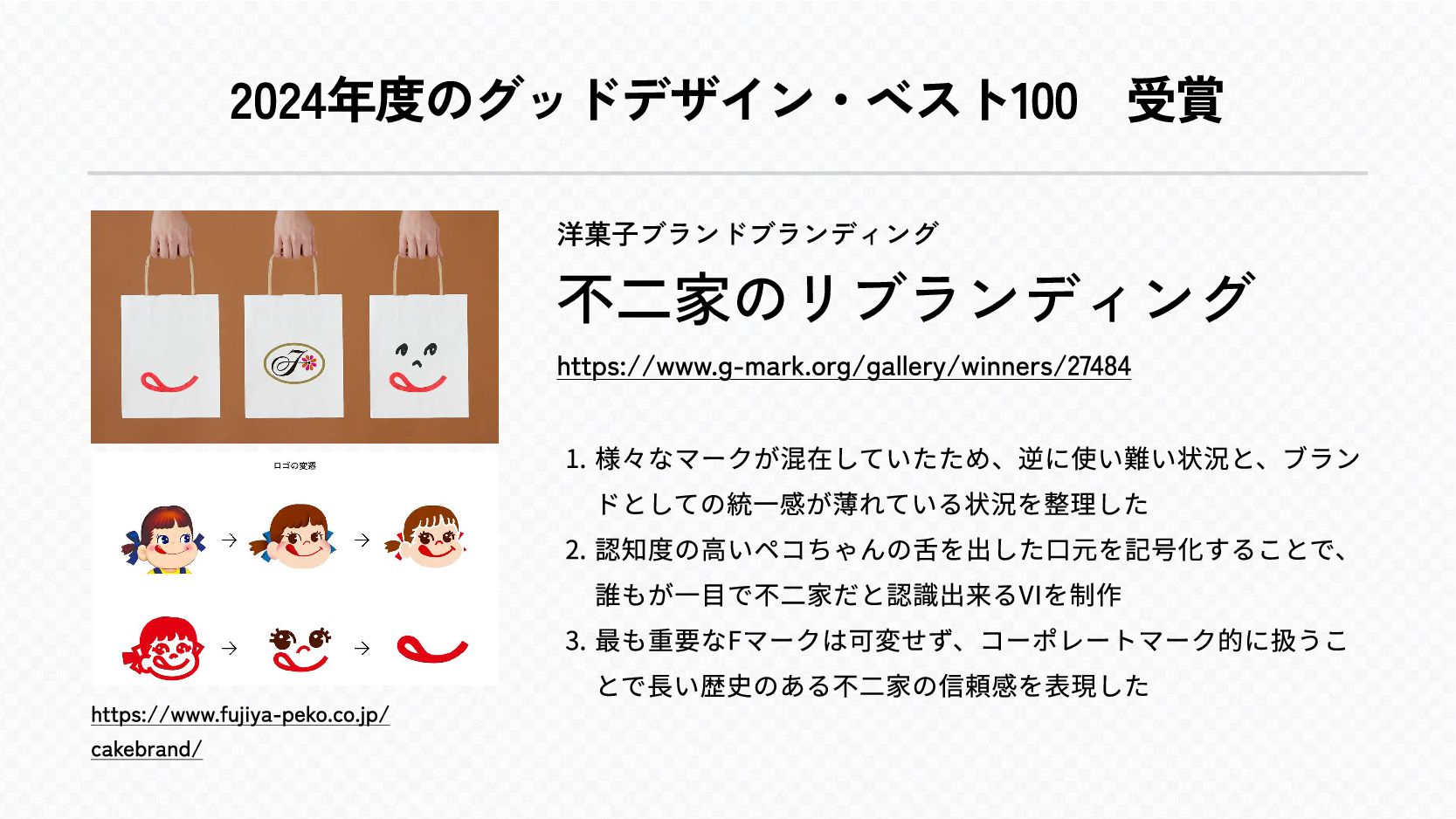 2024年度のグッドデザイン・ベスト100 受賞 https://www.fujiya-peko.co.jp/ cakebrand/ 洋菓子ブランドブランディング 不二家のリブランディング https://www.g-mark.org/gallery/winners/27484 ¹¬ 様々なマークが混在していたため、逆に使い難い状況と、ブラン ドとしての統一感が薄れている状況を整理し ¬