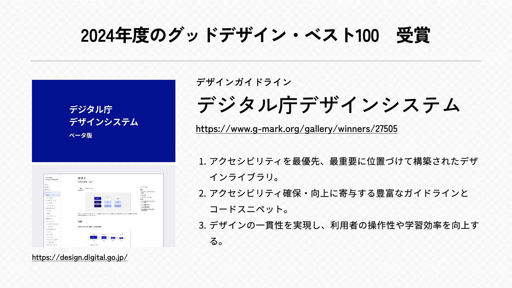 2024年度のグッドデザイン・ベスト100 受賞 https://design.digital.go.jp/ デザインガイドライン デジタル庁デザインシステム https://www.g-mark.org/gallery/winners/27505 アクセシビリティを最優先、最重要に位置づけて構築されたデザ インライブラリo アクセシビリティ確保・向上に寄与する豊富なガイドラインと