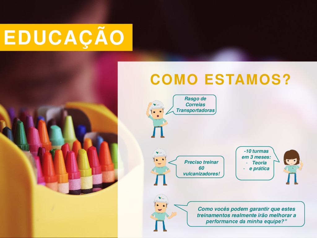 realmente irão melhorar a performance da minha equipe?” Preciso treinar 60 vulcanizadores! -10 turmas em 3 meses: - Teoria - e prática Rasgo de Correias Transportadoras