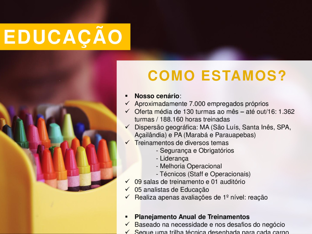 próprios Oferta média de 130 turmas ao mês – até out/16: 1.362 turmas / 188.160 horas treinadas Dispersão geográfica: MA (São Luís, Santa Inês, SPA, Açailândia) e PA (Marabá e Parauapebas) Treinamentos de diversos temas - Segurança e Obrigatórios - Liderança - Melhoria Operacional - Técnicos (Staff e Operacionais) 09 salas de treinamento e 01 auditório 05 analistas de Educação Realiza apenas avaliações de 1º nível: reação Planejamento Anual de Treinamentos Baseado na necessidade e nos desafios do negócio