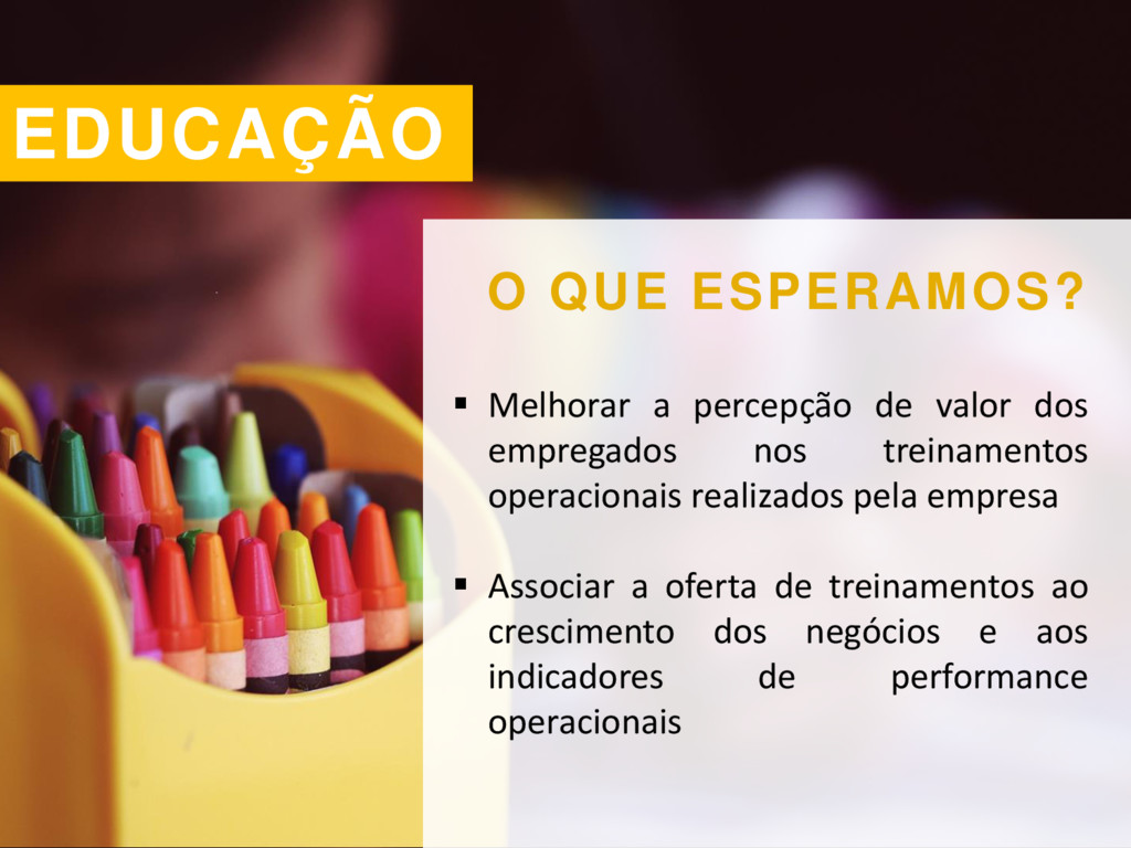 operacionais realizados pela empresa Associar a oferta de treinamentos ao crescimento dos negócios e aos indicadores de performance operacionais EDUCAÇÃO O QUE ESPERAMOS?